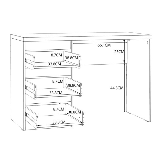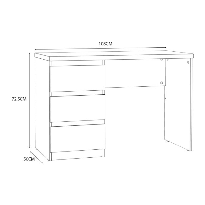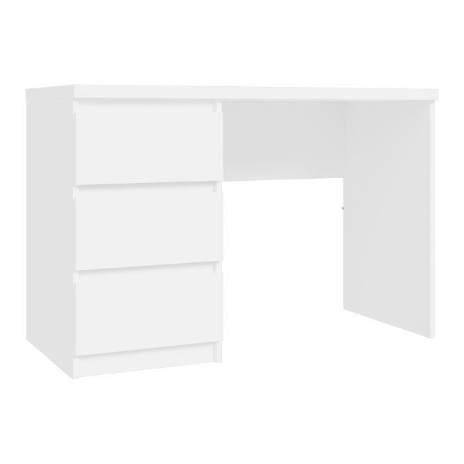 Nowoczesne biurko w dekorze Biały Uni Mat stanowi elegancki element w pokoju młodzieżowym, jak i gabinecie. Trzy pojemne szuflady stanowią wystarczająco dużo miejsca do przechowywania wszystkich akcesoriów biurowych, książek lub dokumentów.