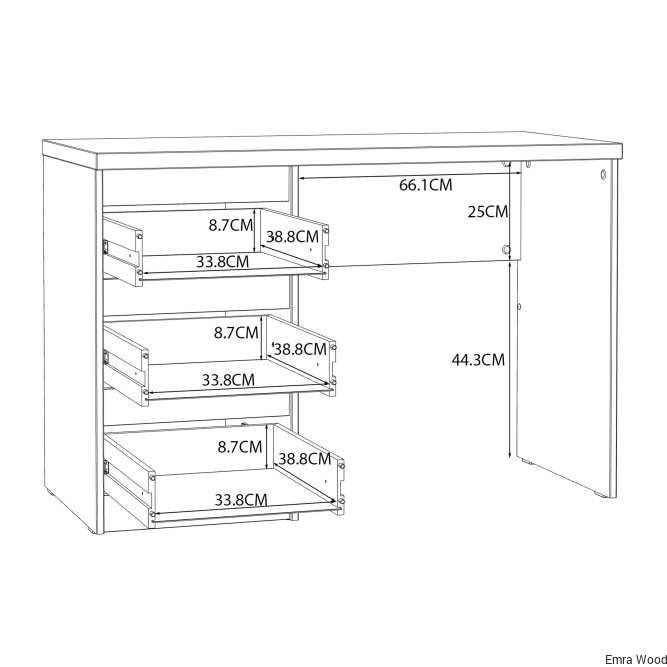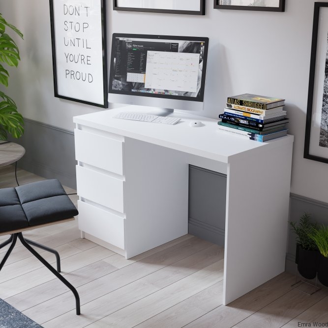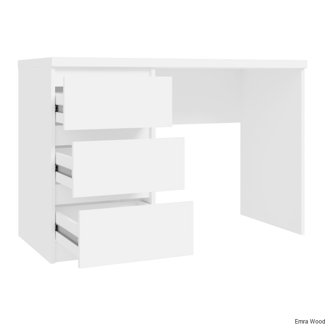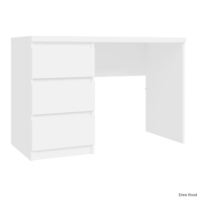Nowoczesne biurko w dekorze Biały Uni Mat stanowi elegancki element w pokoju młodzieżowym, jak i gabinecie. Trzy pojemne szuflady stanowią wystarczająco dużo miejsca do przechowywania wszystkich akcesoriów biurowych, książek lub dokumentów.