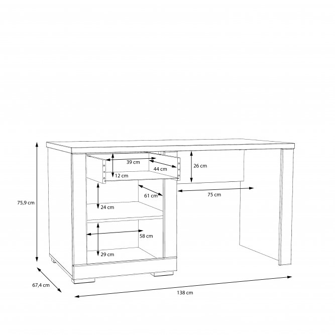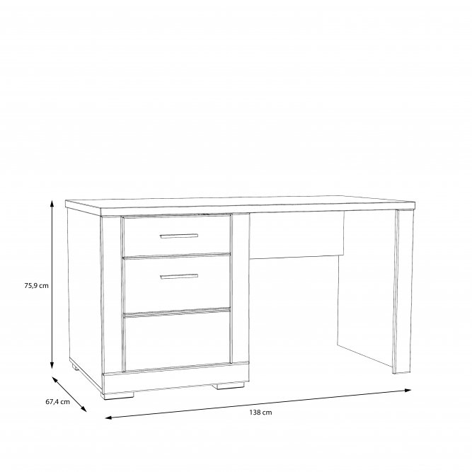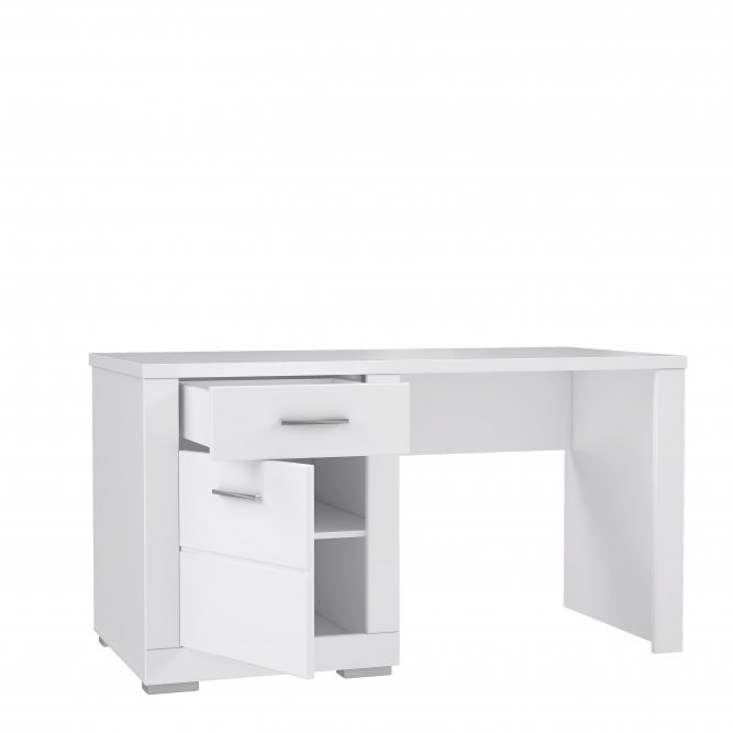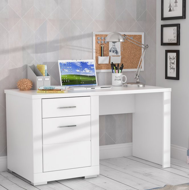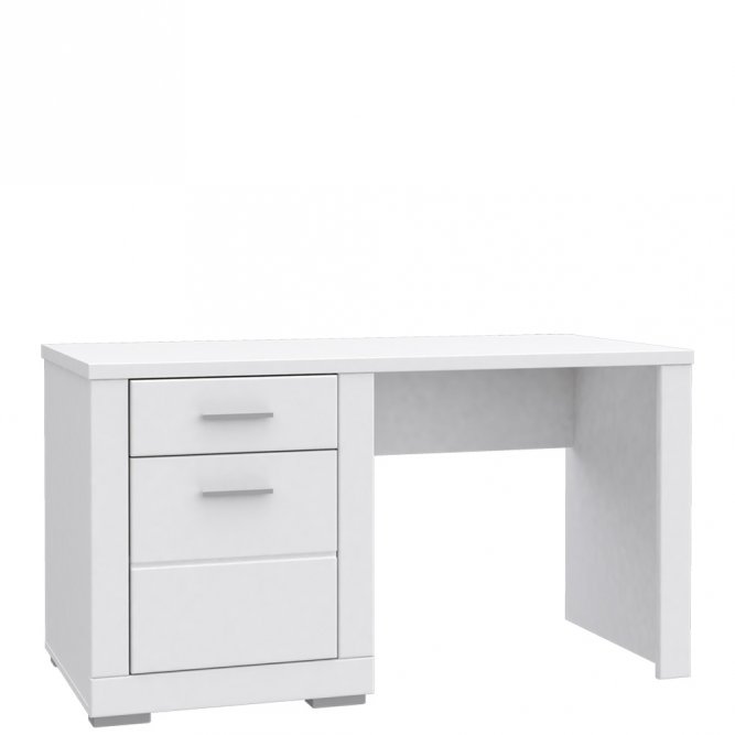Nowoczesne biurko z pewnością spodoba się nastolatkom. Mebel został wykonany w dekorze Białym i posiada dużą przestrzeń roboczą. Front szuflady i szafki osadzony został pomiędzy szerokimi ramami mebla.