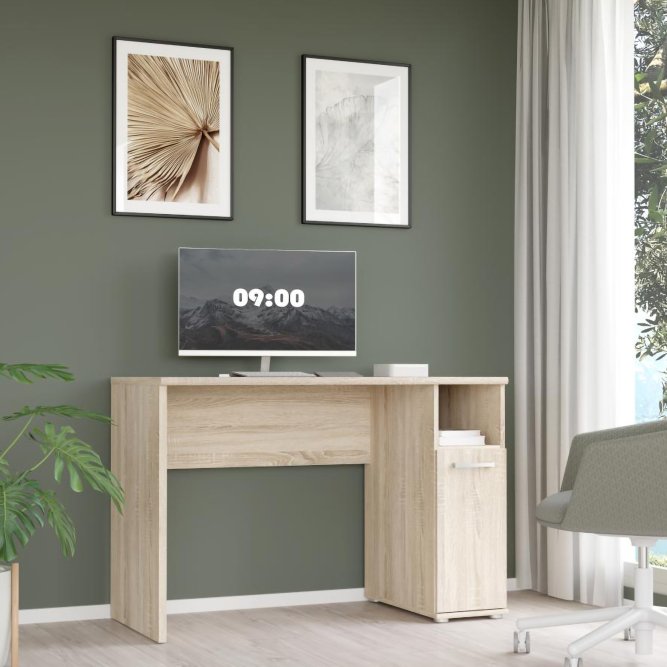 Biurko w stylu nowoczesnym idealnie sprawdzi się w domowym biurze. Wykonane zostało w dekorze Dąb Sonoma imitującym naturalne usłojenie drewna. Posiada odpowiednio dużo miejsca do przechowywania przyborów biurowych.