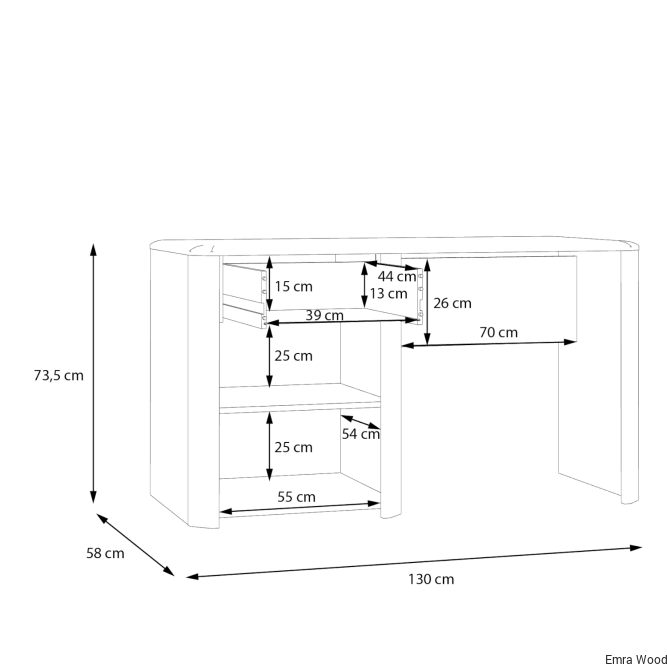 • Mebel posiada jedną półkę z płyty, jedną otwartą wnękę oraz praktyczną szufladę