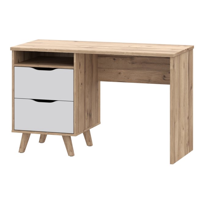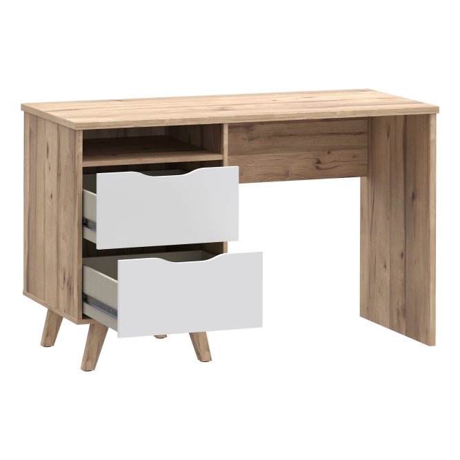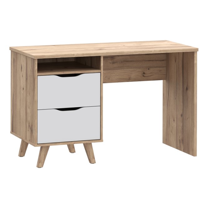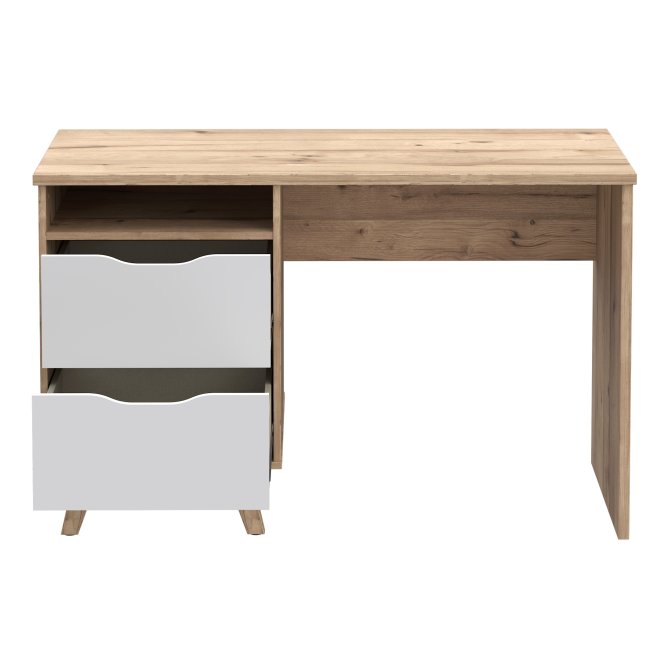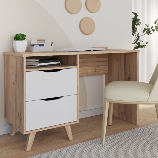 To eleganckie biurko o wymiarach 119,7 cm szerokości, 75 cm wysokości i 52,7 cm głębokości to idealne rozwiązanie dla każdego, kto ceni sobie komfort pracy i estetykę. Minimalistyczny design sprawia, że doskonale wpisuje się w różne aranżacje przestrzeni. Wykonane w charakterystycznym stylu kolekcji VANKKA, łączy dekor dębowej deski z białymi frontami szuflad, tworząc harmonijną i nowoczesną całość. Biurko stoi na charakterystycznych nóżkach, które są typowe dla kolekcji VANKKA, dodając meblowi lekkości i nowoczesnego charakteru.