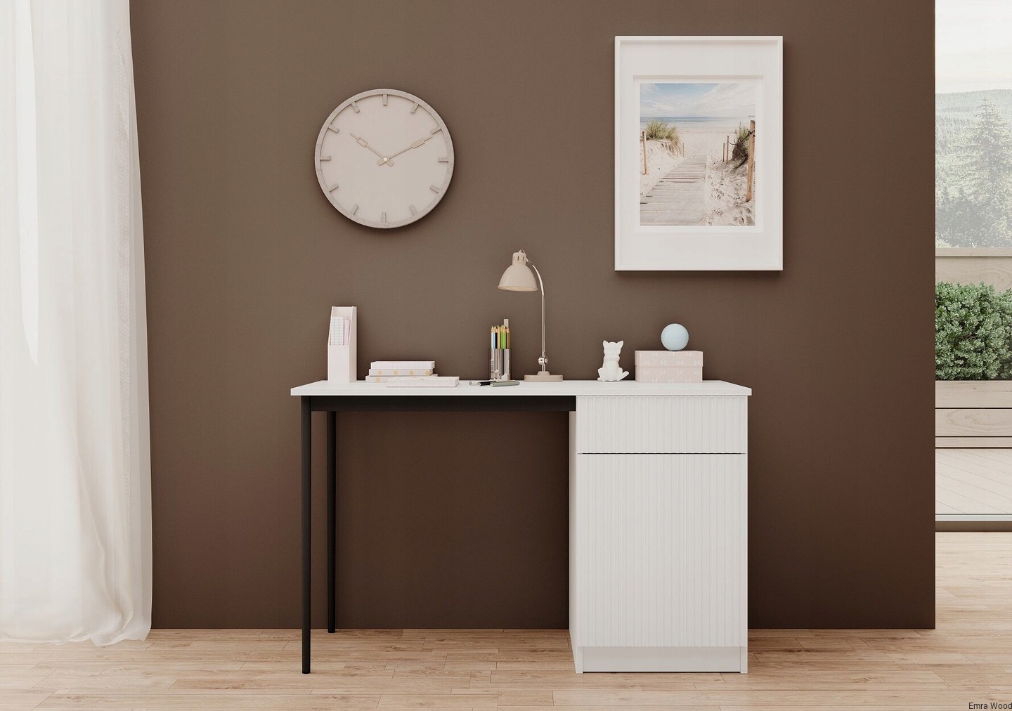 Biurko Nicole zostało wykonane z wysokiej jakości płyty laminowanej oraz MDF, co gwarantuje jego wytrzymałość i długowieczność. Dodatkowo, posiada cichy system otwierania i zamykania szuflady i drzwi, co zdecydowanie zwiększa komfort użytkowania. Metalowe nogi z podkładką gumową zapewniają stabilność i bezpieczeństwo.