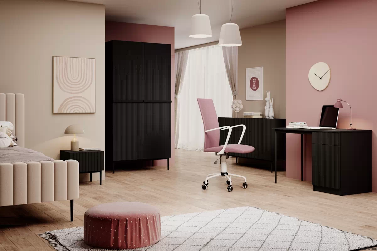 Biurko Nicole to nie tylko piękno, ale przede wszystkim funkcjonalność. Wykonane jest z płyty laminowanej 16 mm i frontu z płyty MDF 18 mm, co gwarantuje jego trwałość i odporność na uszkodzenia. Posiada metalowe nogi z podkładką gumową, dzięki czemu jest stabilne i nie rysuje podłogi. Dodatkowo wyposażone jest w szufladę i półkę, co pozwala na przechowywanie niezbędnych przy pracy przedmiotów.