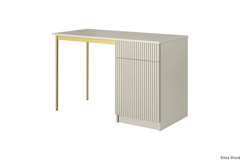 Biurko Nicole to prawdziwy majstersztyk wśród mebli biurowych. Jego wyjątkowa kolorystyka - kaszmir o matowym wykończeniu, połączona z złotymi nóżkami, doda Twojemu biuru eleganckiego wyglądu.