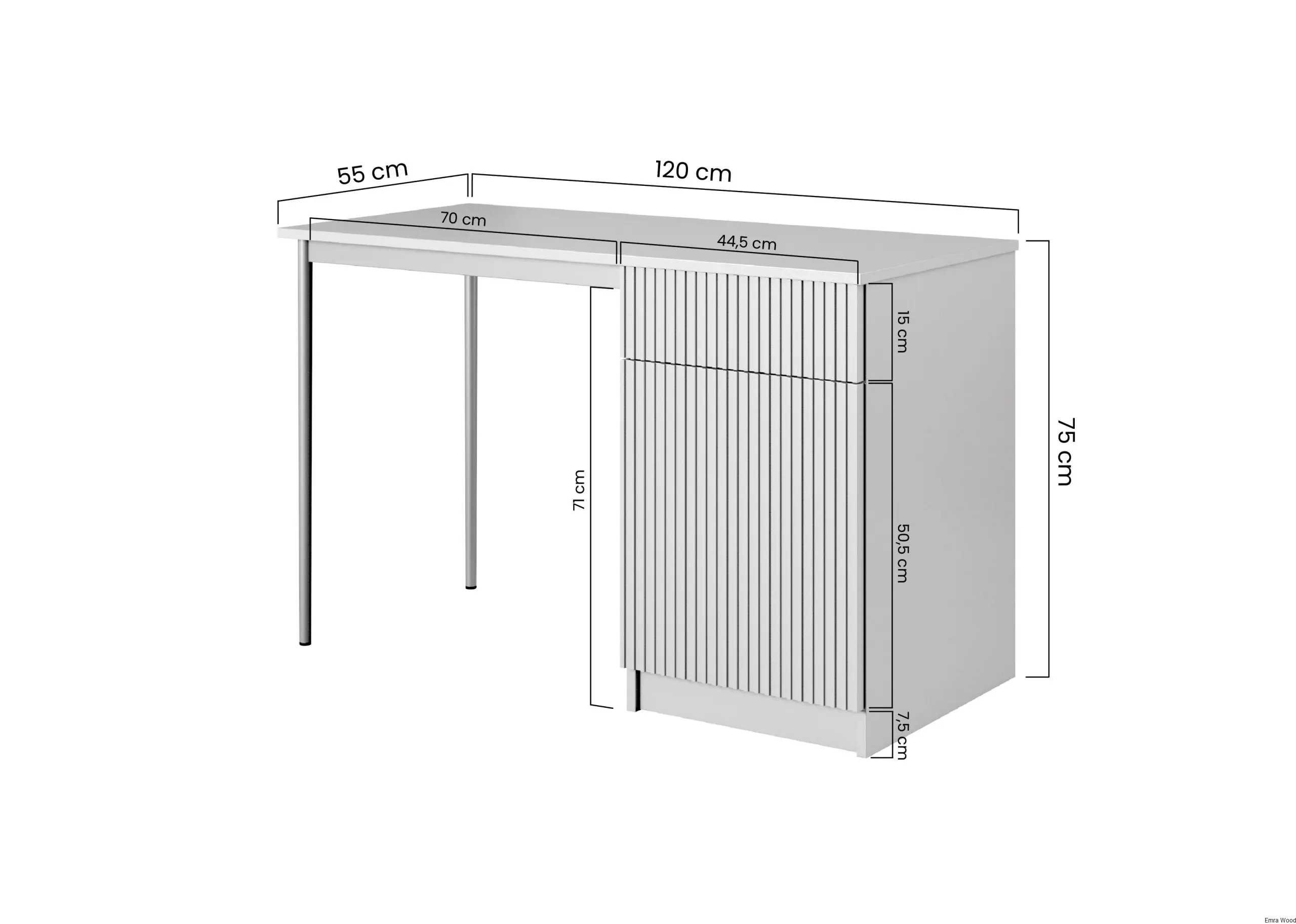 Mebel jest wykonany z najwyższej jakości materiałów. Korpus zrobiony jest z płyty laminowanej 16 mm, a front z płyty MDF 18 mm. Dodatkowo, biurko wyposażone jest w metalowe nóżki z podkładką gumową, malowane proszkowo, co zapewnia stabilność i trwałość. Wykończenie obrzeż z ABS oraz stalowe zawiasy z cichym domykiem dodają elegancji i funkcjonalności.