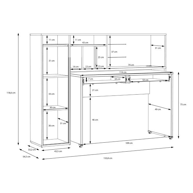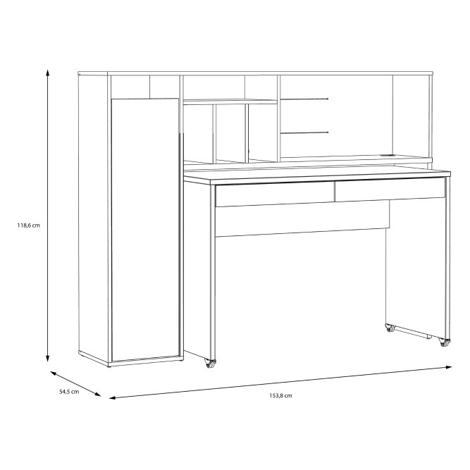 | Funkcjonalne biurko o wymiarach: szerokość 153,8 cm x wysokość 118,6 cm x głębokość 54,5 cm |