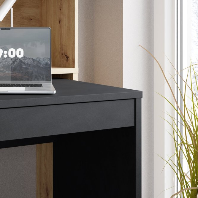 Biurko na kółkach z regałem TRYNIDAD to idealny wybór, jeżeli chcesz umeblować pokój młodzieżowy lub domowe biuro. Wyposażone w wygodny, wysuwany blat, tworzy komfortowe miejsce do pracy i nauki. Dwie szuflady umieszczone pod blatem oraz dobudowany regał dookoła blatu, wyposażony w liczne półki i szafkę umożliwiają przechowywanie najważniejszych rzeczy w pobliżu miejsca pracy. Mebel polecany jest zwłaszcza do pomieszczeń, w których dominuje styl nowoczesny i industrialny.