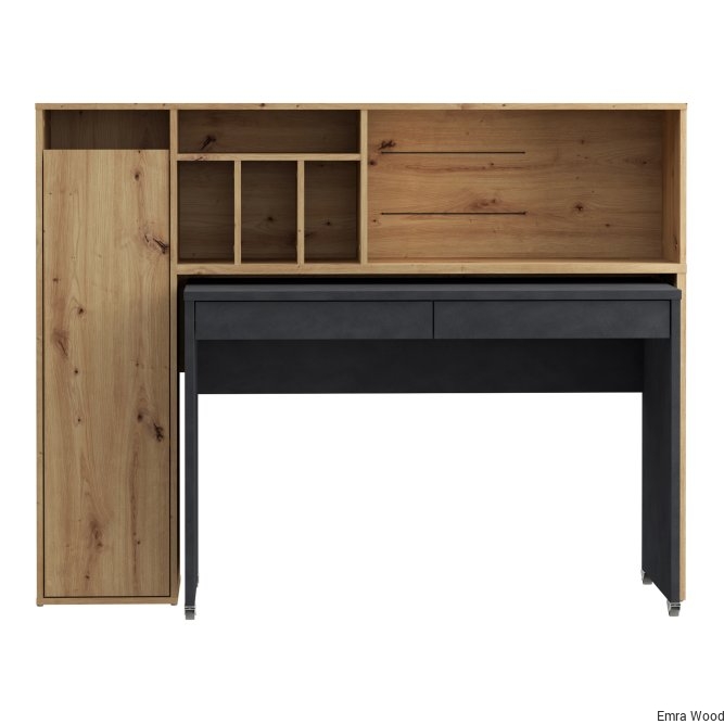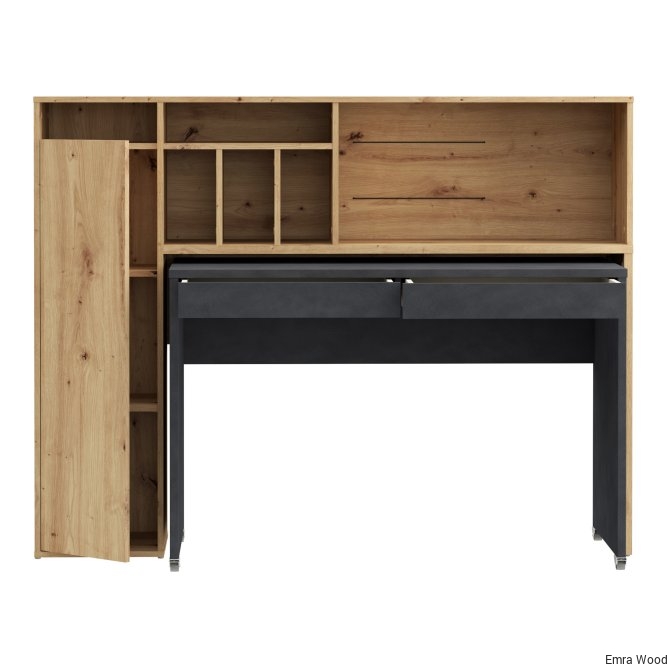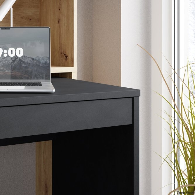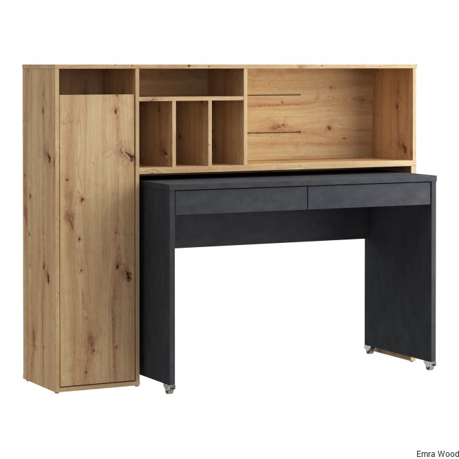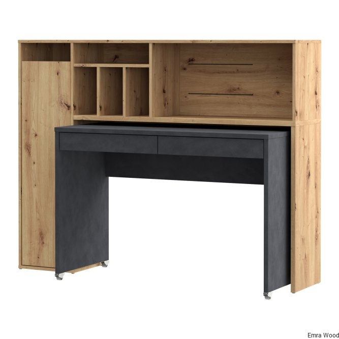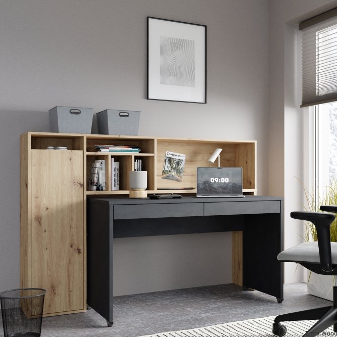 Biurko na kółkach z regałem TRYNIDAD to idealny wybór, jeżeli chcesz umeblować pokój młodzieżowy lub domowe biuro. Wyposażone w wygodny, wysuwany blat, tworzy komfortowe miejsce do pracy i nauki. Dwie szuflady umieszczone pod blatem oraz dobudowany regał dookoła blatu, wyposażony w liczne półki i szafkę umożliwiają przechowywanie najważniejszych rzeczy w pobliżu miejsca pracy. Mebel polecany jest zwłaszcza do pomieszczeń, w których dominuje styl nowoczesny i industrialny.