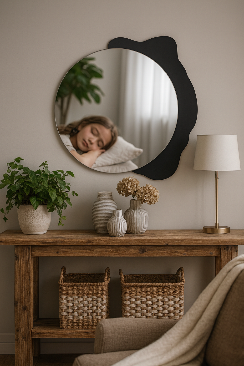 Rodzaj lustra: lustro wielopłaszczyznowe – lustro, które składa się z kilku tafli połączonych ze sobą wedle projektu. Elementy nie są zlicowane w jedną powierzchnię
