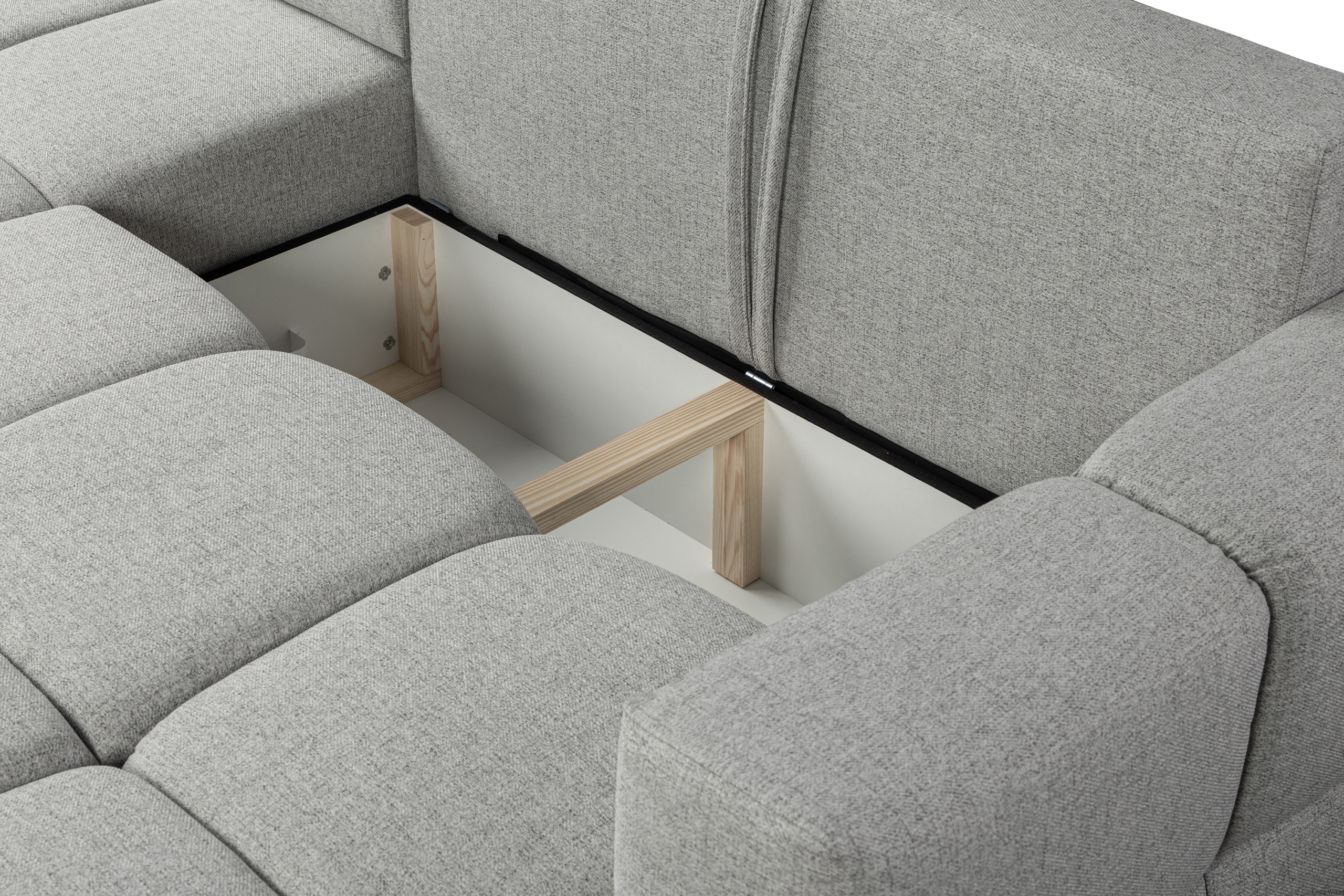 Dodatkowo narożnik został wyposażony w pojemnik na pościel, który umożliwia przechowywanie koce, poduszek i pościeli w jednym miejscu. Dzięki temu wnętrze pozostaje schludne, a wszystkie niezbędne tekstylia są zawsze pod ręką. To rozwiązanie sprawia, że narożnik Fumo łączy styl z praktycznością i pomaga w utrzymaniu porządku w salonie.