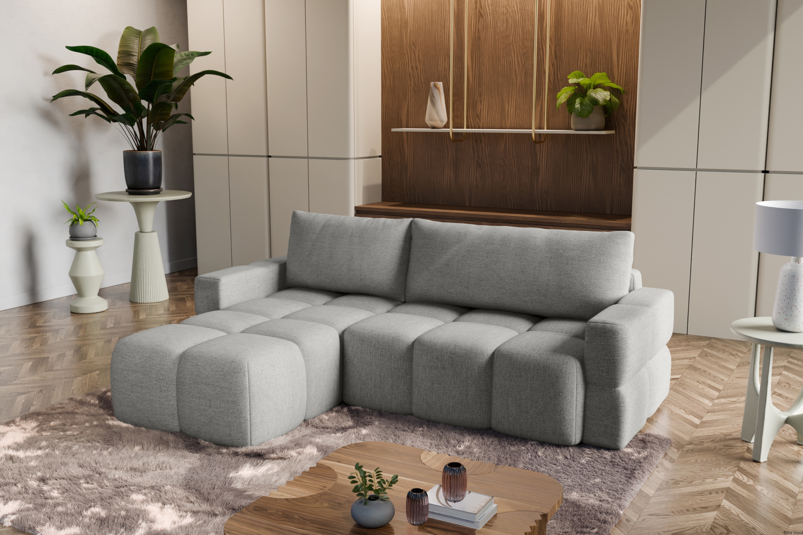 Narożnik Fumo świetnie sprawdzi się w nowoczesnych, minimalistycznych salonach, jak również w przestrzeniach utrzymanych w klasycznej stylistyce. Doskonale komponuje się z jasnymi ścianami, drewnianą podłogą oraz subtelnymi dodatkami dekoracyjnymi, np. poduszkami w kontrastowych kolorach, miękkimi pledami lub designerskimi stolikami kawowymi. W większych salonach narożnik może stać się centralnym punktem strefy wypoczynkowej, a w mniejszych wnętrzach wprowadzi funkcjonalność i komfort bez przytłaczania przestrzeni.