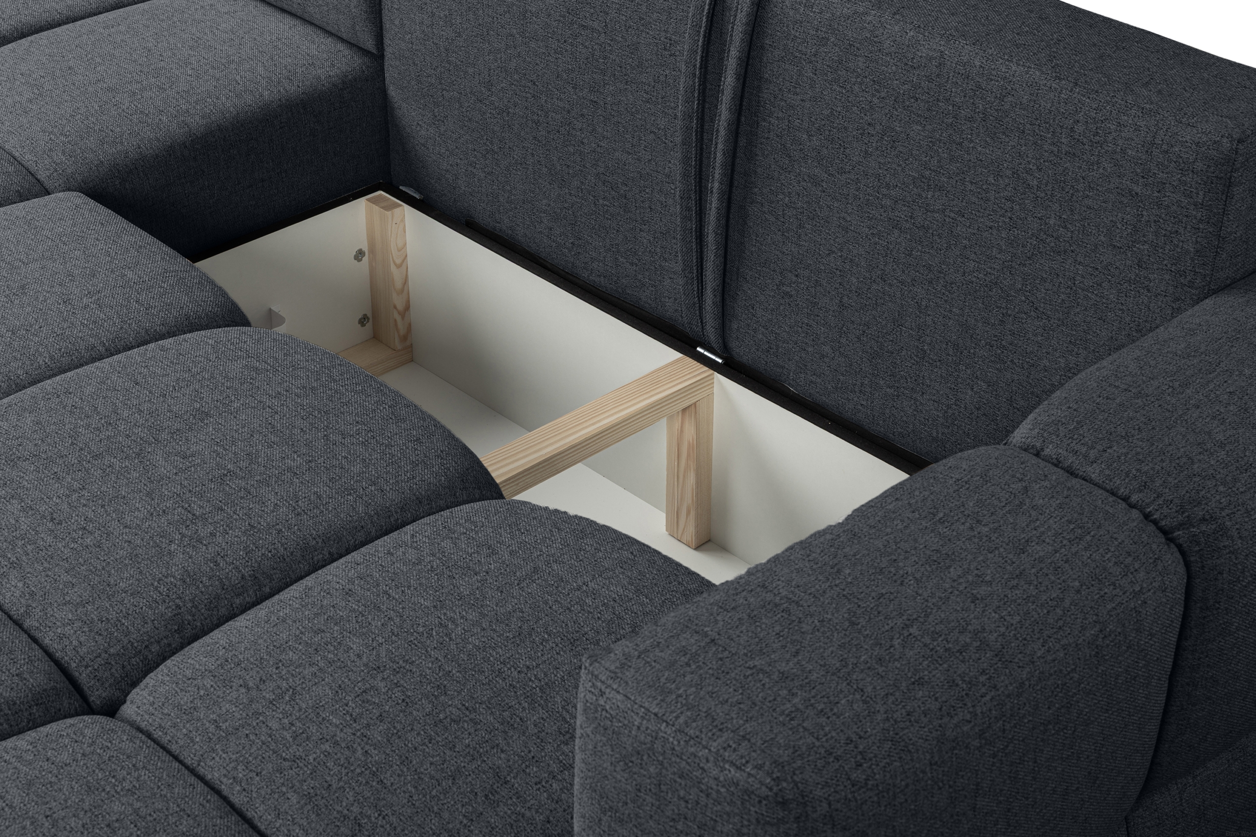 Dodatkowo narożnik został wyposażony w pojemnik na pościel, który umożliwia przechowywanie koce, poduszek i pościeli w jednym miejscu. Dzięki temu wnętrze pozostaje schludne, a wszystkie niezbędne tekstylia są zawsze pod ręką. To rozwiązanie sprawia, że narożnik Fumo łączy styl z praktycznością i pomaga w utrzymaniu porządku w salonie.