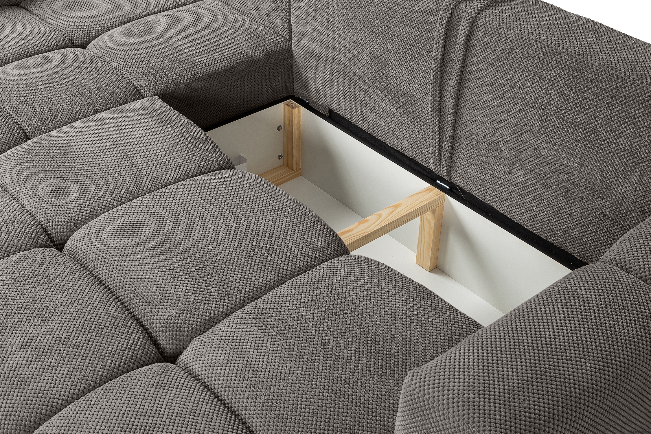 Dodatkowo narożnik został wyposażony w pojemnik na pościel, który umożliwia przechowywanie koce, poduszek i pościeli w jednym miejscu. Dzięki temu wnętrze pozostaje schludne, a wszystkie niezbędne tekstylia są zawsze pod ręką. To rozwiązanie sprawia, że narożnik Fumo łączy styl z praktycznością i pomaga w utrzymaniu porządku w salonie.