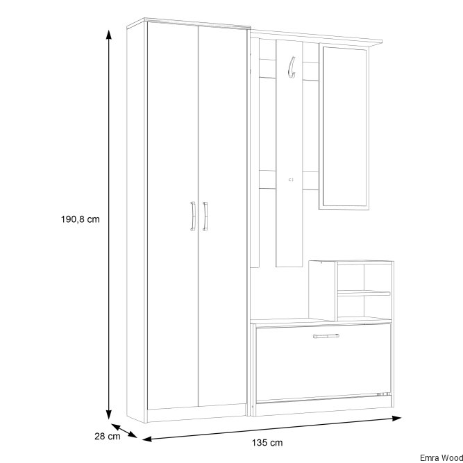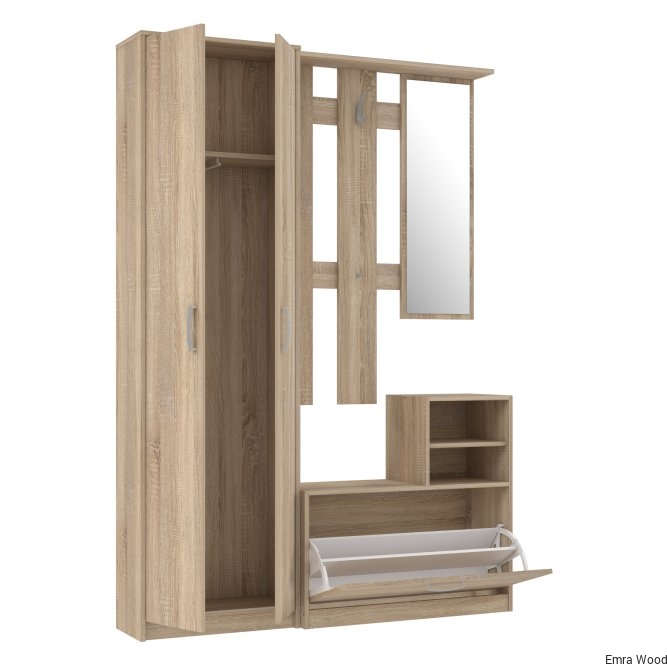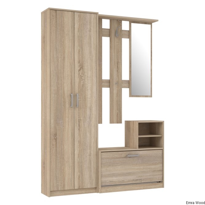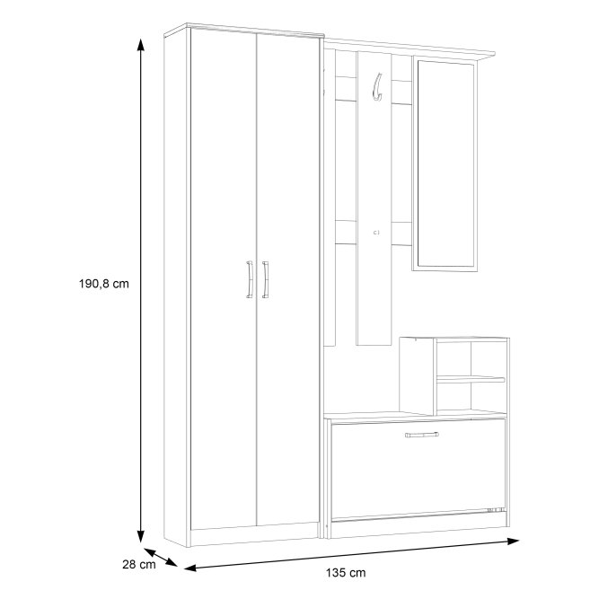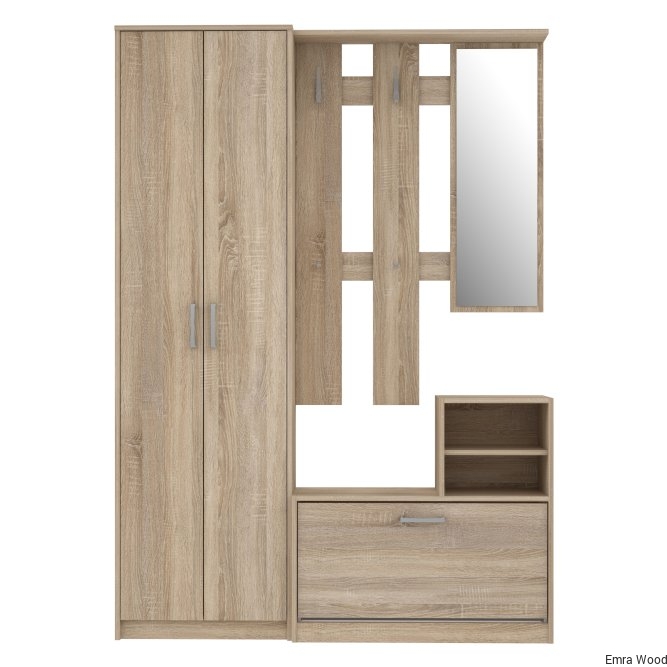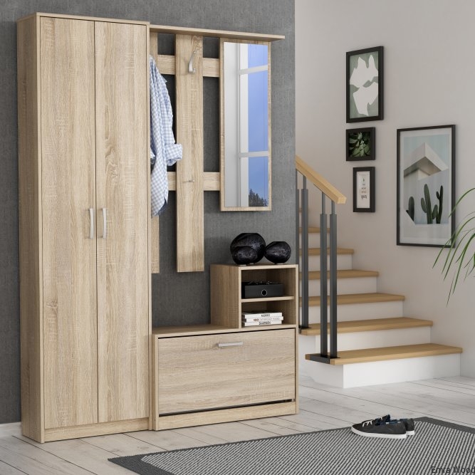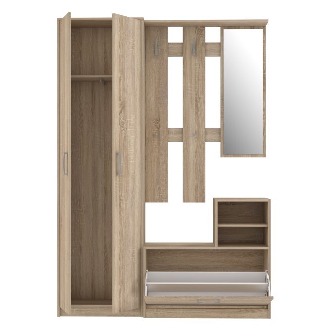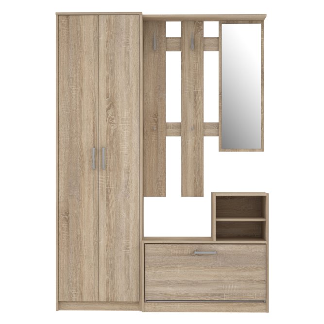 Kompleksowy zestaw funkcjonalnych mebli do nowoczesnego przedpokoju. Jej wyposażenie oraz funkcjonalne siedzisko ułatwiają wygodne korzystanie z mebla. Zestaw ten wykonany jest w dekorze Dąb Sonoma, dzięki czemu można go idealnie skomponować z innymi meblami z tej samej kolekcji.