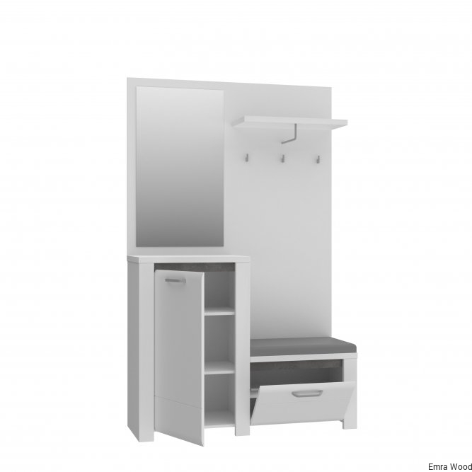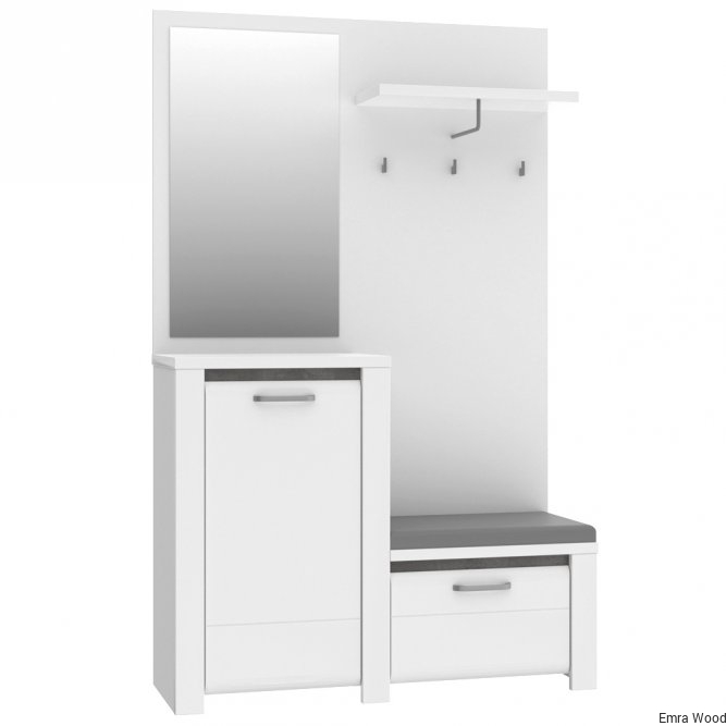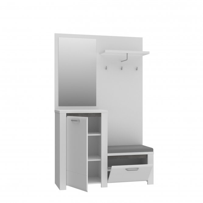 Zestaw meblowy do przedpokoju będzie idealnym miejscem do przechowywania ubrań, butów i innych niezbędnych akcesoriów. Zintegrowany mebel wyposażony jest w panel ubraniowy, wygodne tapicerowane siedzisko, szafkę na buty oraz duże, przejrzyste lustro. Subtelny dekor Biały Połysk zestawiony z kontrastującymi z nim elementami w dekorze Beton Ciemnoszary doda pomieszczeniu uroku i elegancji.