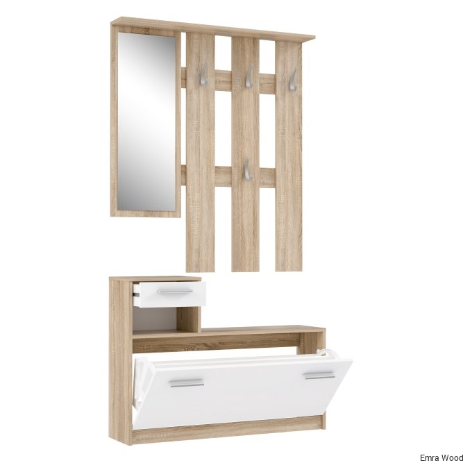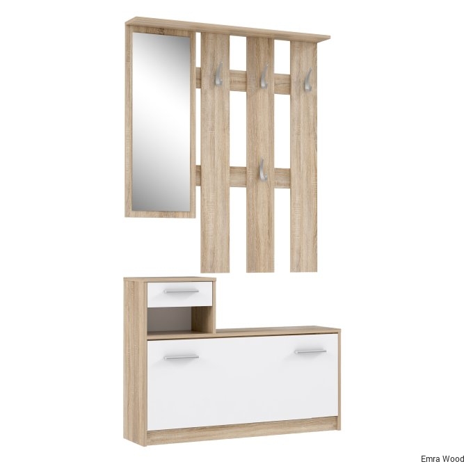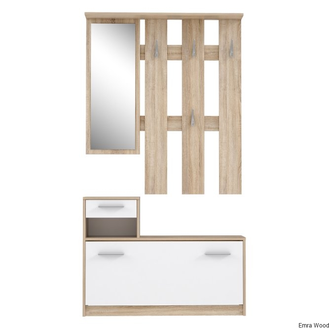 Ten kompaktowy zestaw do przedpokoju umożliwia posiadanie wszystkiego pod ręką dzięki wieszakom, szufladzie i szafce na buty. Ponadto zestaw ten ma również lustro i dodatkową otwartą półkę pod szufladą na niezbędne przedmioty. Jest to prosty i funkcjonalny mebel do każdego przedpokoju.