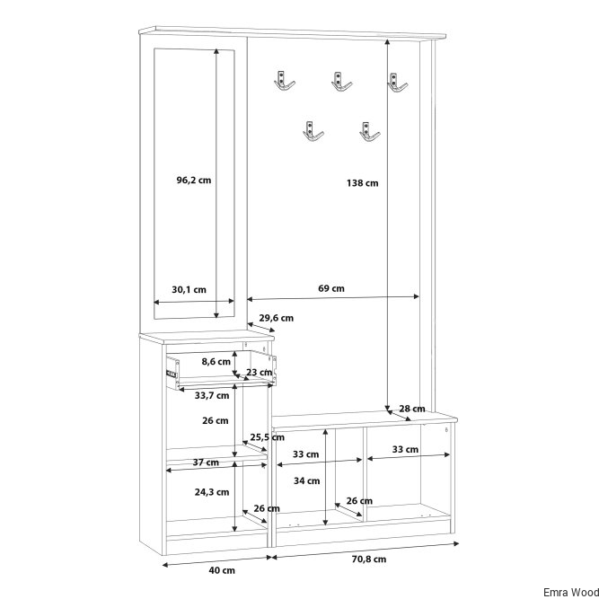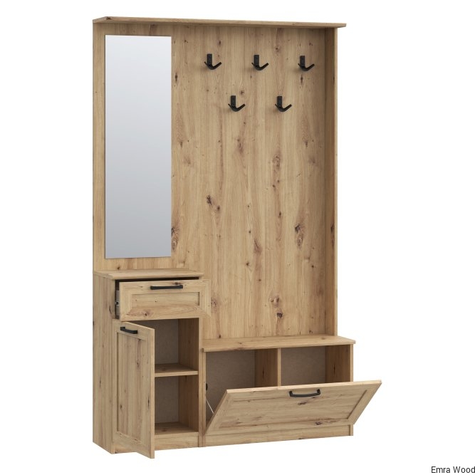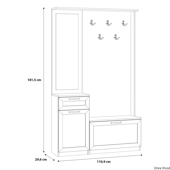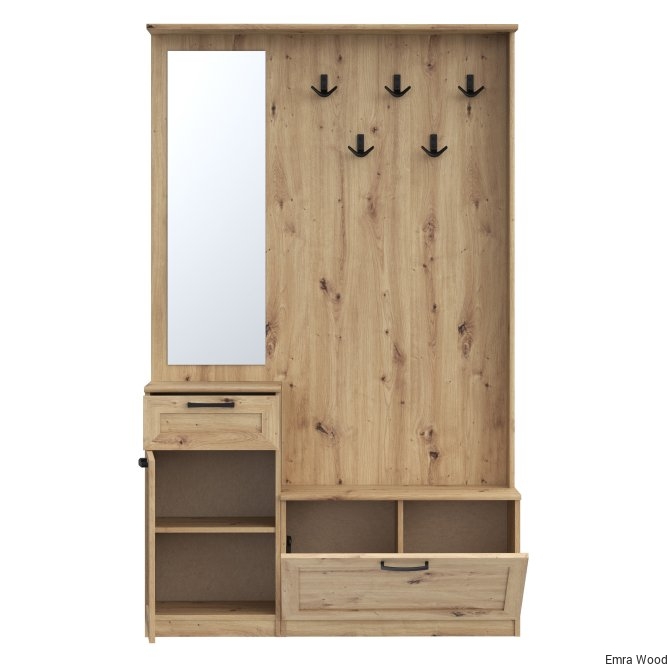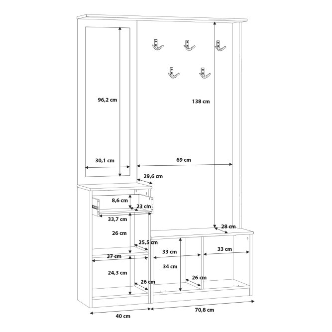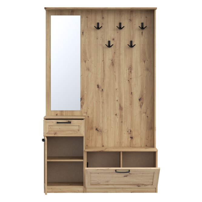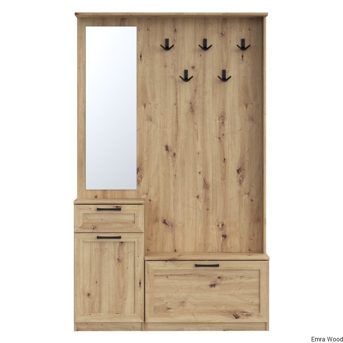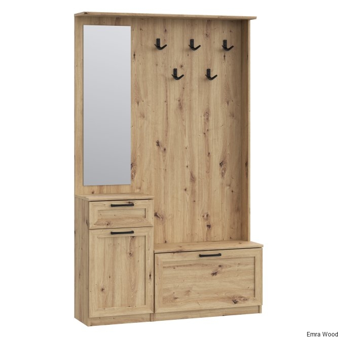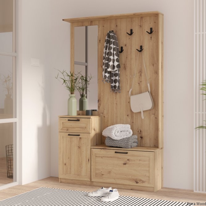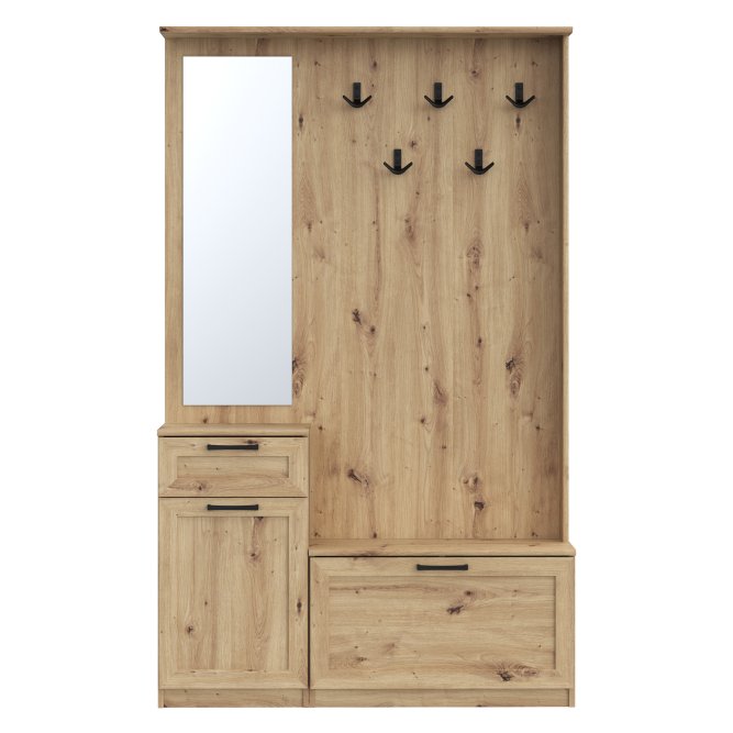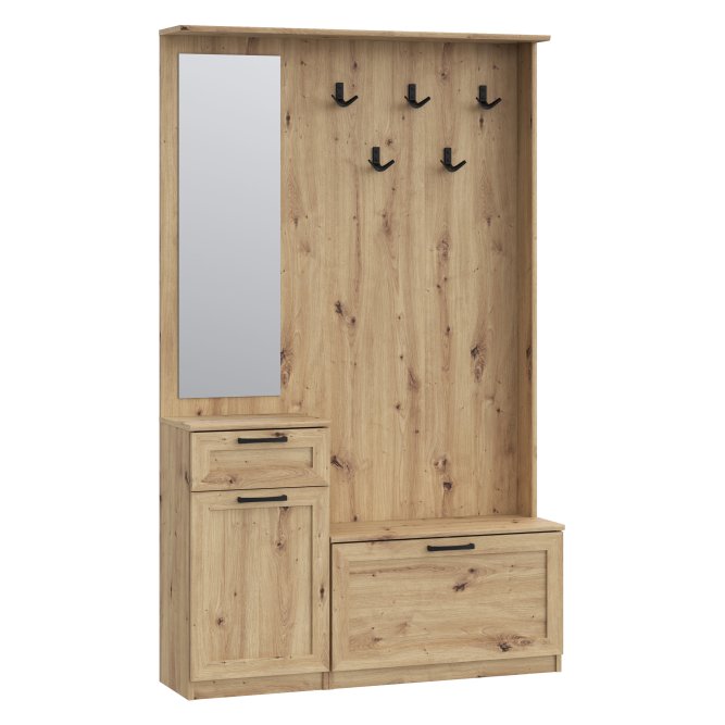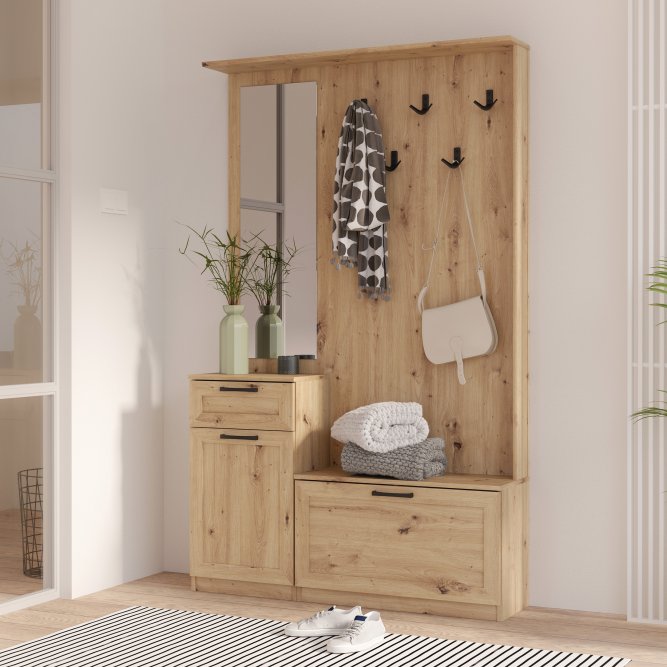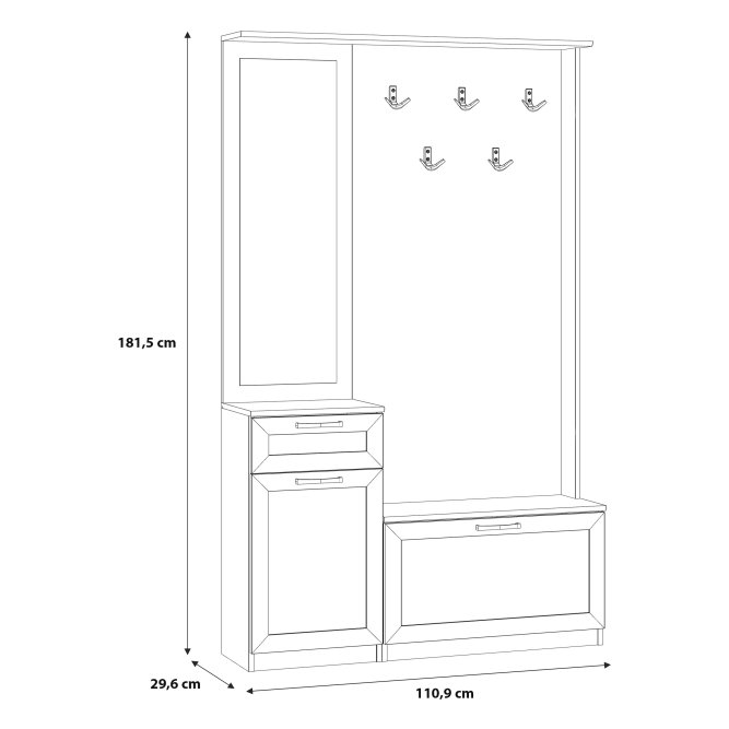 Przedpokój NIKO to element wyposażenia przedpokoju w nowoczesnym stylu i tym, który ceni loftowe akcenty. Mebel stanowi połączenie panelu z wieszakami, szafki na buty, lustra oraz kompaktowej komody. Prosta stylistyka zostałą przełamana czarnymi, metalowymi elementami - uchwytami i haczykamie, które nadają loftowy charakter całości. POtrzebujesz dodatkowych mebli do przedpokoju? Sprawdź całą kolekcję NIKO.