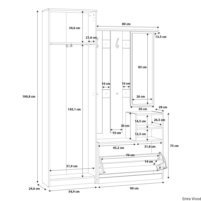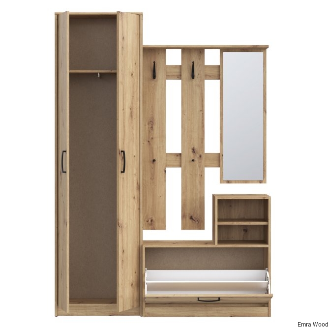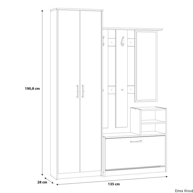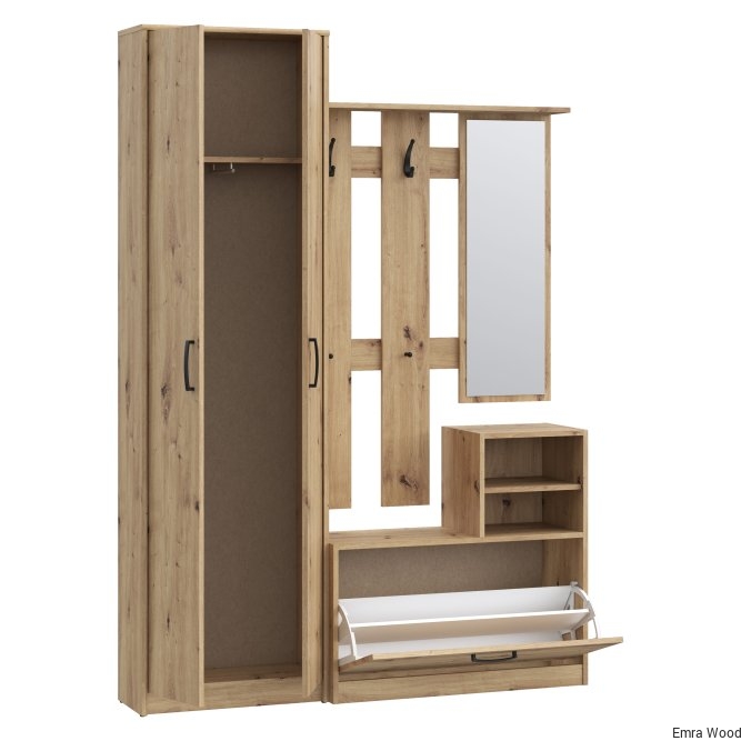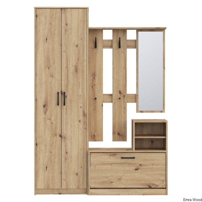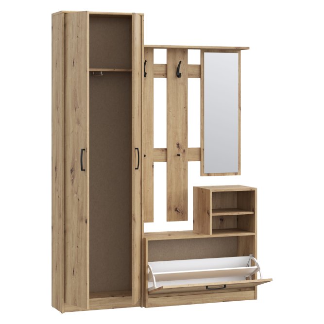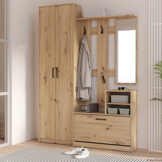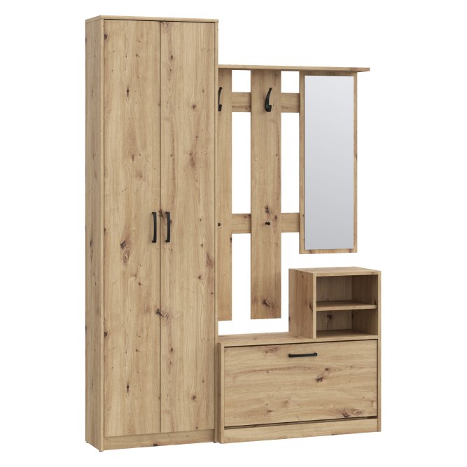 Przedpokój NIKO to zestaw składający się z szafy, szafki na buty, panelu z wieszakami i lustra. Takie połączenie idealnie sprawdzi się, gdy chcesz kompleksowo wyposażyć przedpokój. Prosta stylistyka mebli i dekor dębu czynią mebel ponadczasowym. Jeżeli potrzebujesz dodatkowej szafy, znajdziesz ją w naszej ofercie.