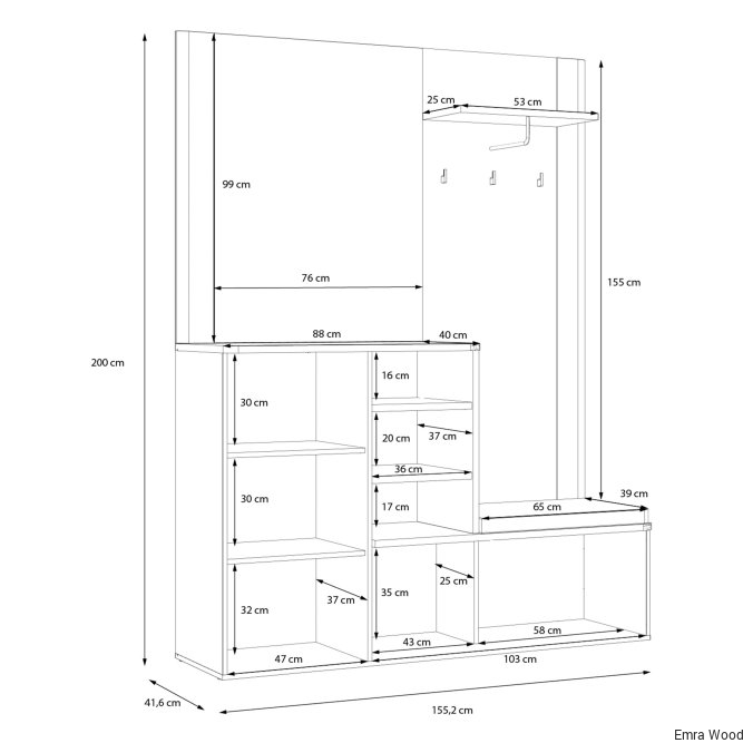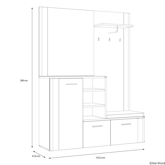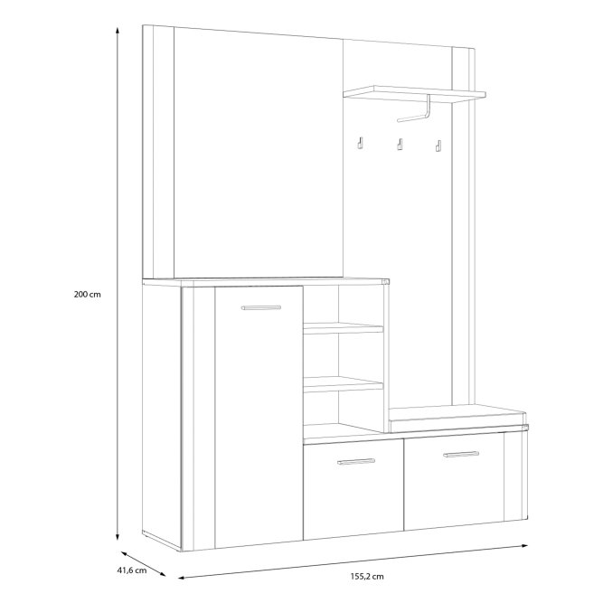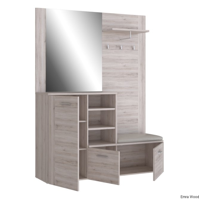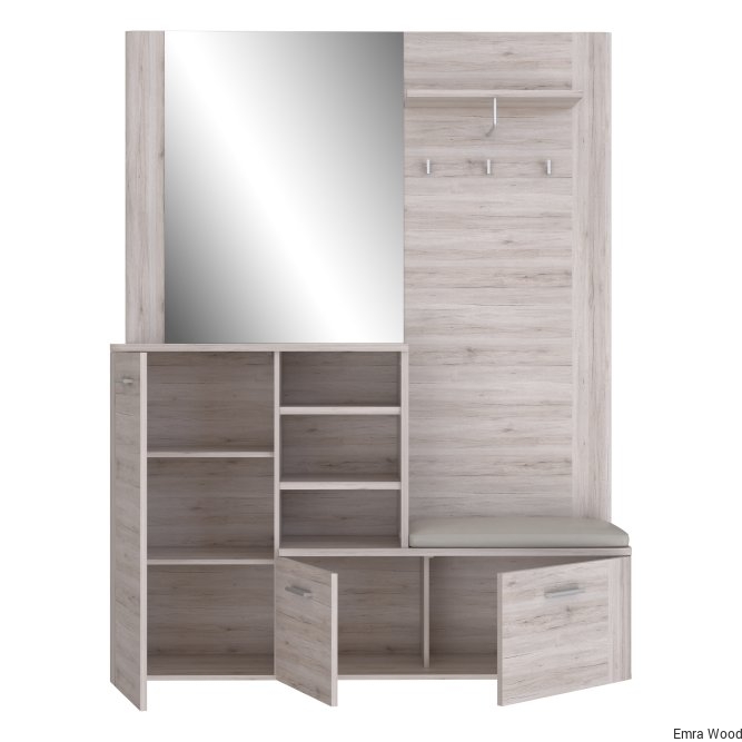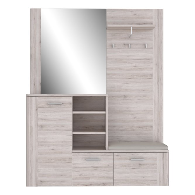 Zestaw meblowy do przedpokoju będzie idealnym miejscem do przechowywania ubrań, butów i innych niezbędnych akcesoriów. Zintegrowany mebel wyposażony jest w panel ubraniowy, wygodne tapicerowane siedzisko, trzy zamykane szafki, trzy otwarte wnęki oraz duże, przejrzyste lustro. Odwzorowujący naturalne usłojenie drewna dekor Dąb Piaskowy subtelnie rozjaśni pomieszczenie oraz doda mu uroku i elegancji.