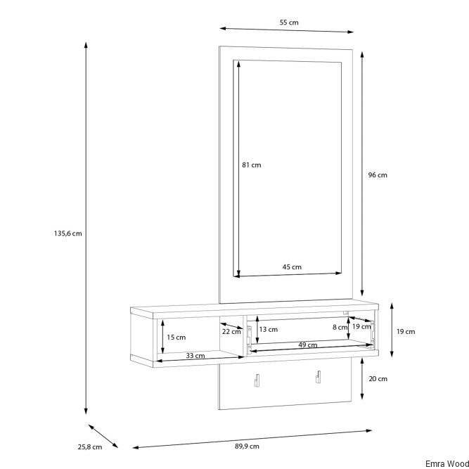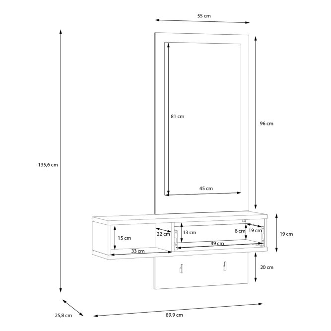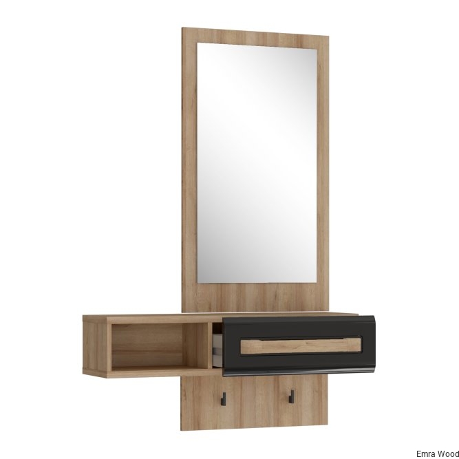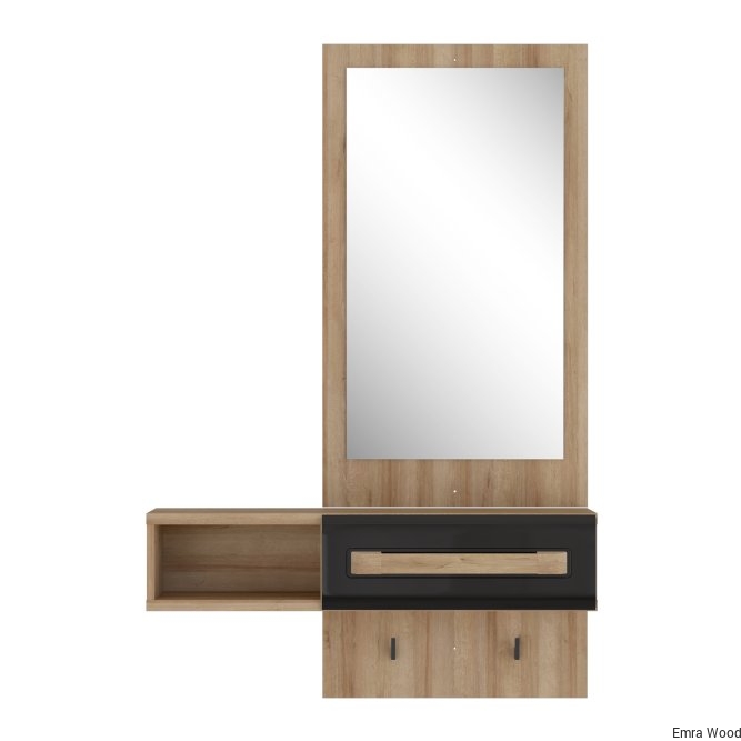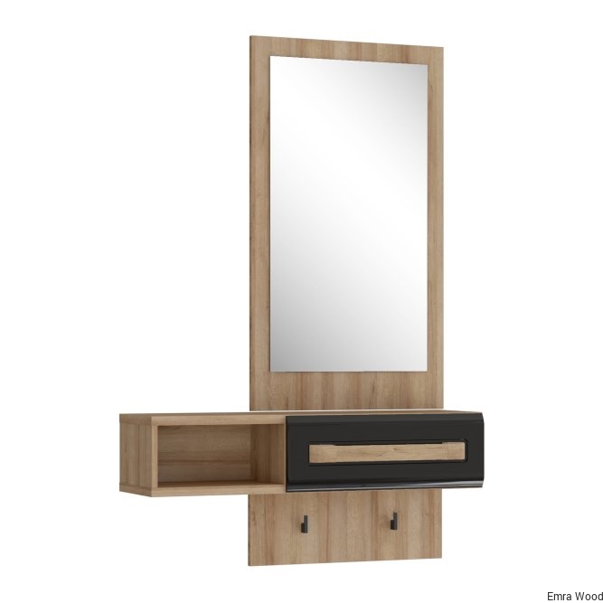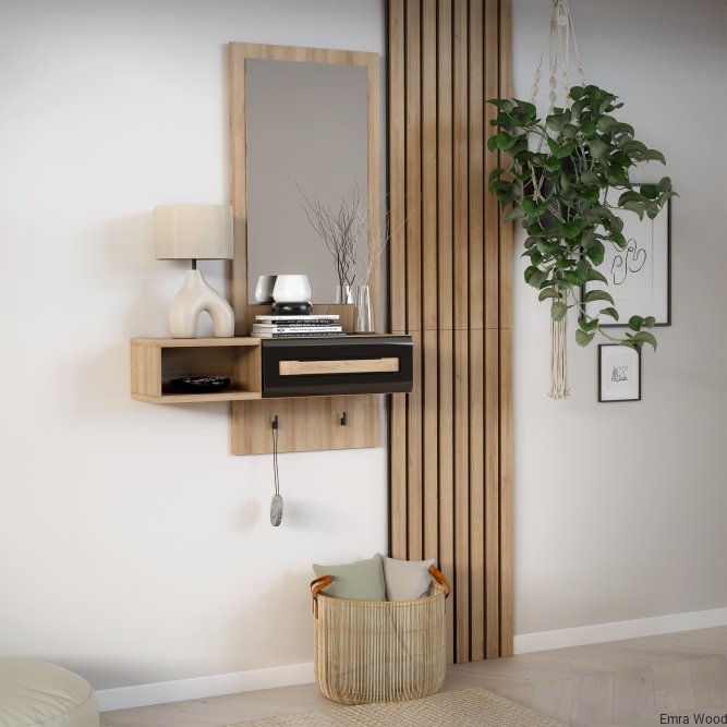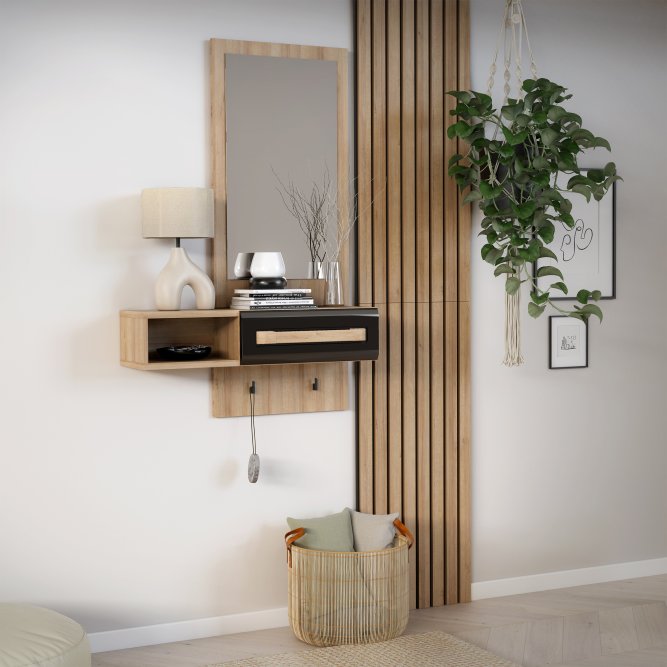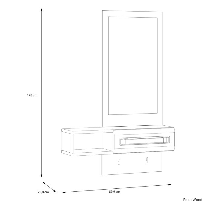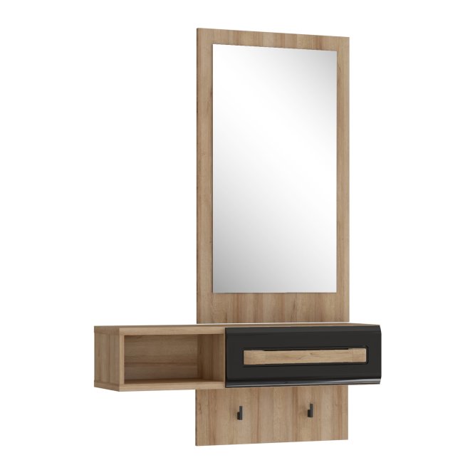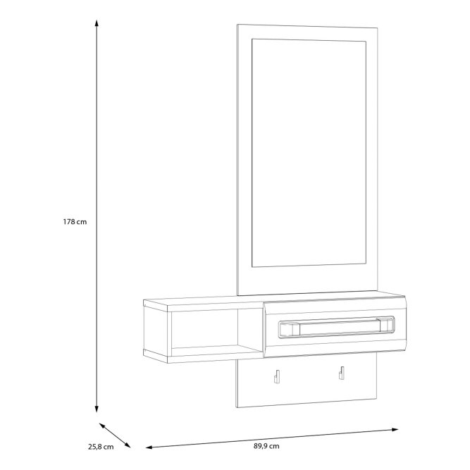 Przedpokój ATTENTION to kompaktowa propozycja do niewielkiego korytarza lub przedsionka. Wyposazony w duże lustro, podręczną szufladę i otwartą przestrzeń tworzy idealne wyposażenie tego pomieszczenia. Na uwagę zasługuje przedłużany panel i umieszczone na nim haczyki - wprost stworzone na klucze, parasolkę lub smycz.