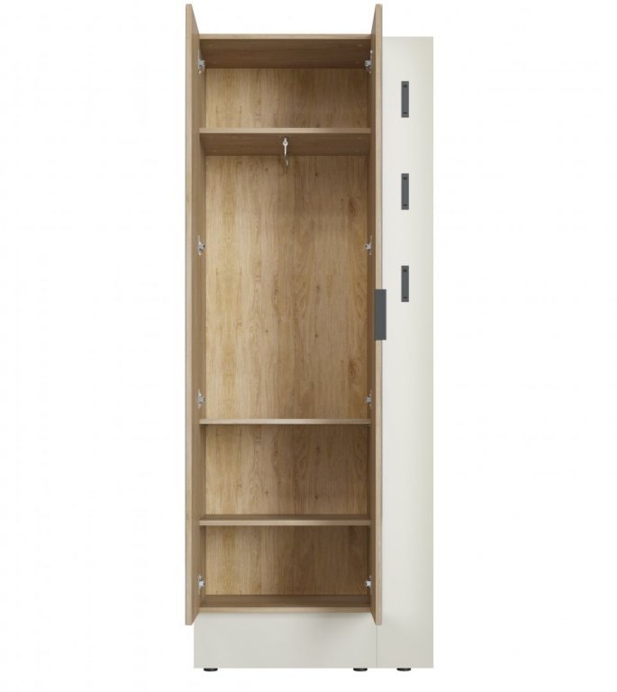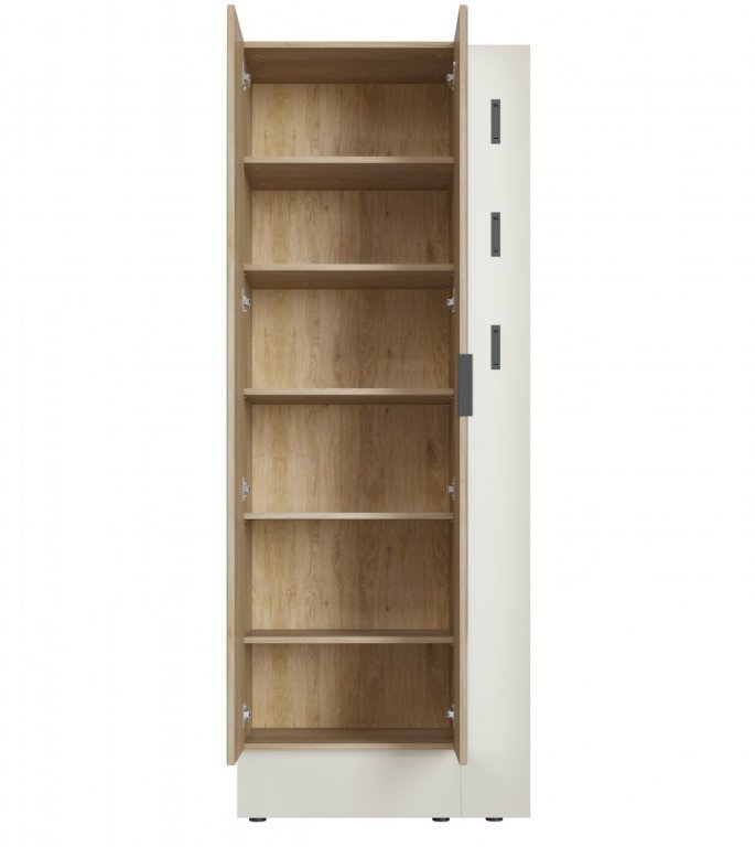 W wąskim, bocznym pasie mebla ukryto trzy metalowe haki typu push-pull; jednym ruchem wysuniesz je, by odwiesić szal, torebkę czy klucze, a po schowaniu front pozostanie idealnie gładki. Tuż obok znajduje się otwarty regał z głębokimi półkami – idealny na buty, czapki lub dekoracyjne kosze. Po otwarciu drzwi czeka pojemne wnętrze: drążek na płaszcze i kurtki, pojemna górna półka na pudła, a także dwie regulowane półki dolne, które z łatwością dostosujesz do wysokości obuwia czy organizerów. Komfort użytkowania zwiększają zawiasy z cichym domykaniem, a stabilność zapewniają niskie, czarne nóżki z możliwością precyzyjnego wypoziomowania.