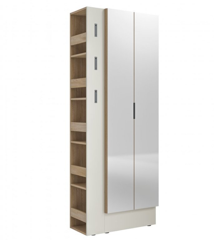 Garderoba SARINA od pierwszej chwili przykuwa wzrok subtelnym odcieniem kaszmiru i ciepłym dekorem dębu Cremona. Pełnowymiarowe lustro na obu skrzydłach drzwi nie tylko pozwala na błyskawiczny przegląd stylizacji tuż przed wyjściem, lecz także wizualnie powiększa i rozjaśnia przedpokój – miejsce, w którym każdy centymetr światła i przestrzeni jest na wagę złota. Smukłe uchwyty zachowują minimalistyczną linię, podkreślając elegancki charakter bryły.