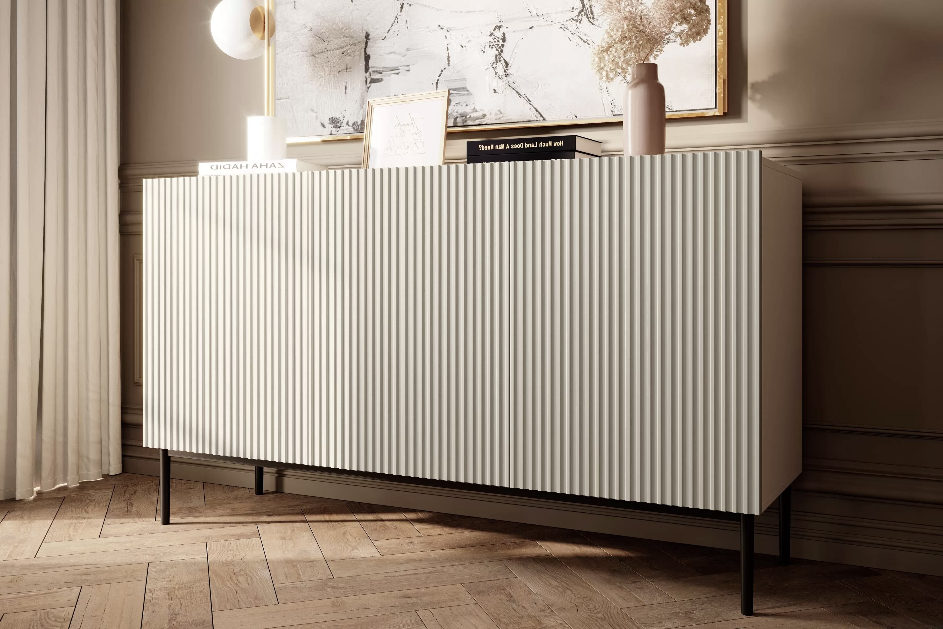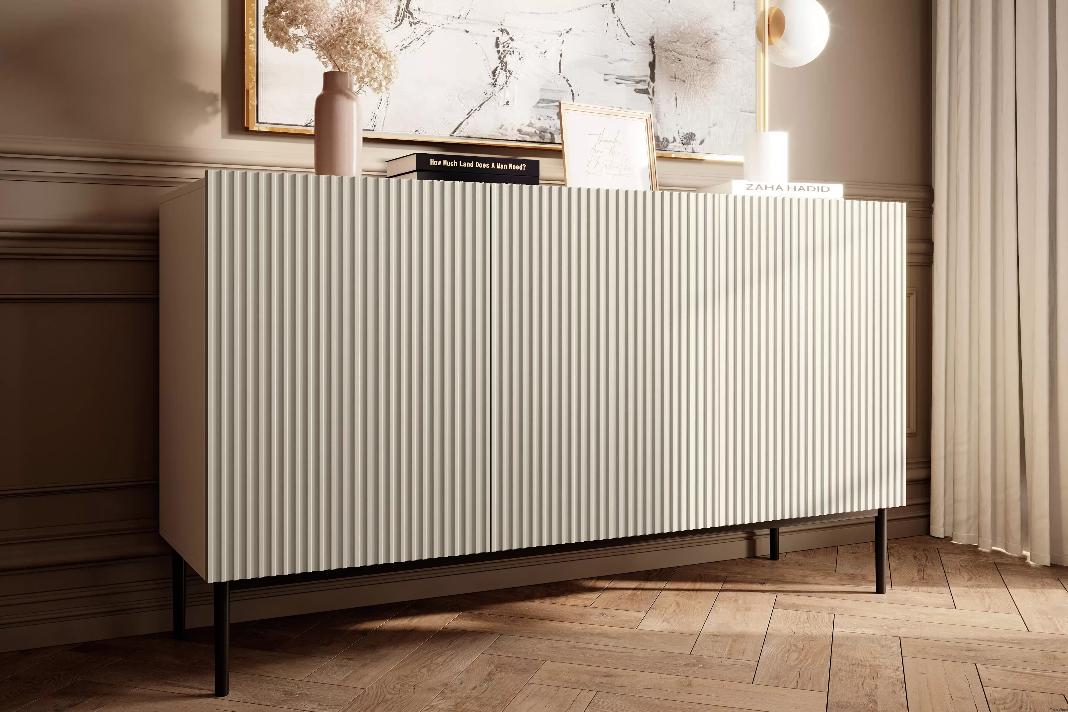 Poszukujesz mebla, który połączy funkcjonalność z niebanalnym designem? Komoda Nicole 150 cm z ryflowanym frontem i metalowymi nogami to rozwiązanie, które spełni wszelkie Twoje oczekiwania.