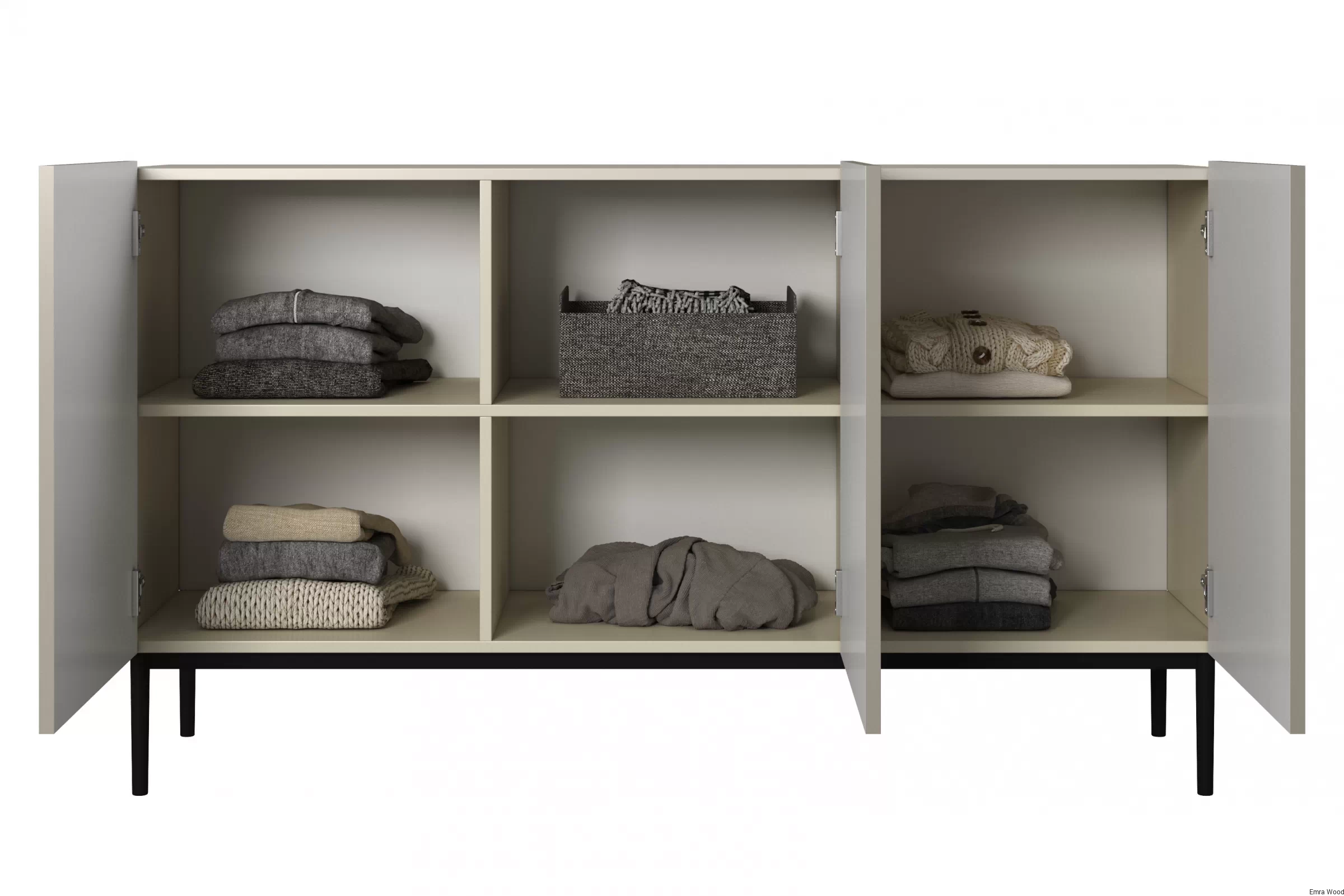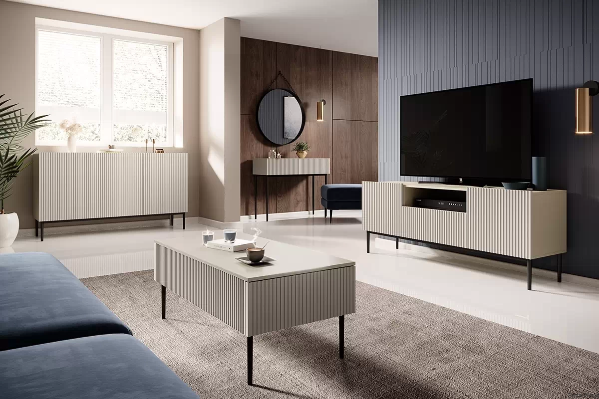 Komoda Nicole to kwintesencja elegancji. Jej ryflowany front w kolorze kaszmiru przyciąga spojrzenia, a czarne, metalowe nóżki dodają jej charakteru. Matowe wykończenie nadaje meblowi subtelności i sprawia, że doskonale wpasuje się w każde wnętrze.