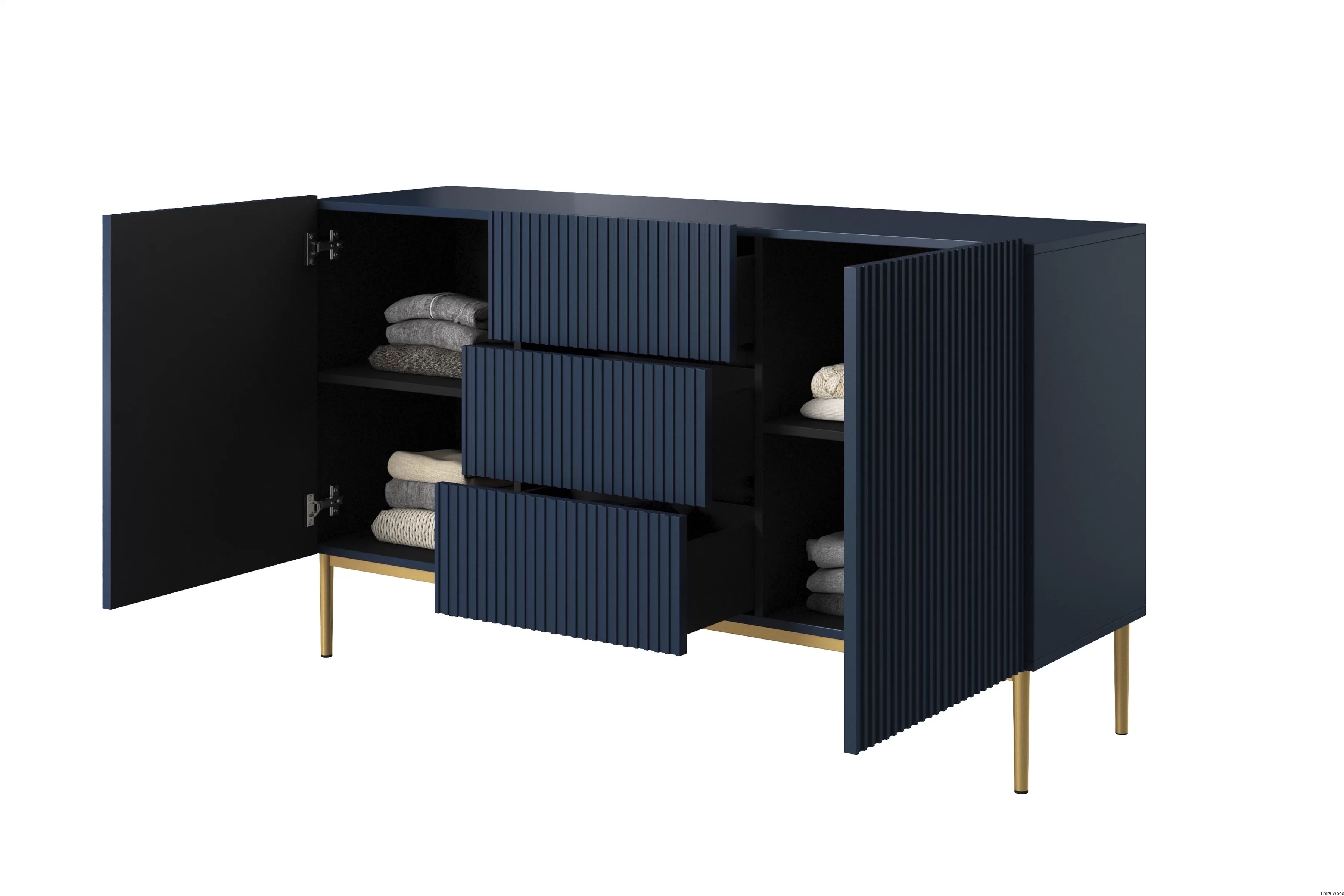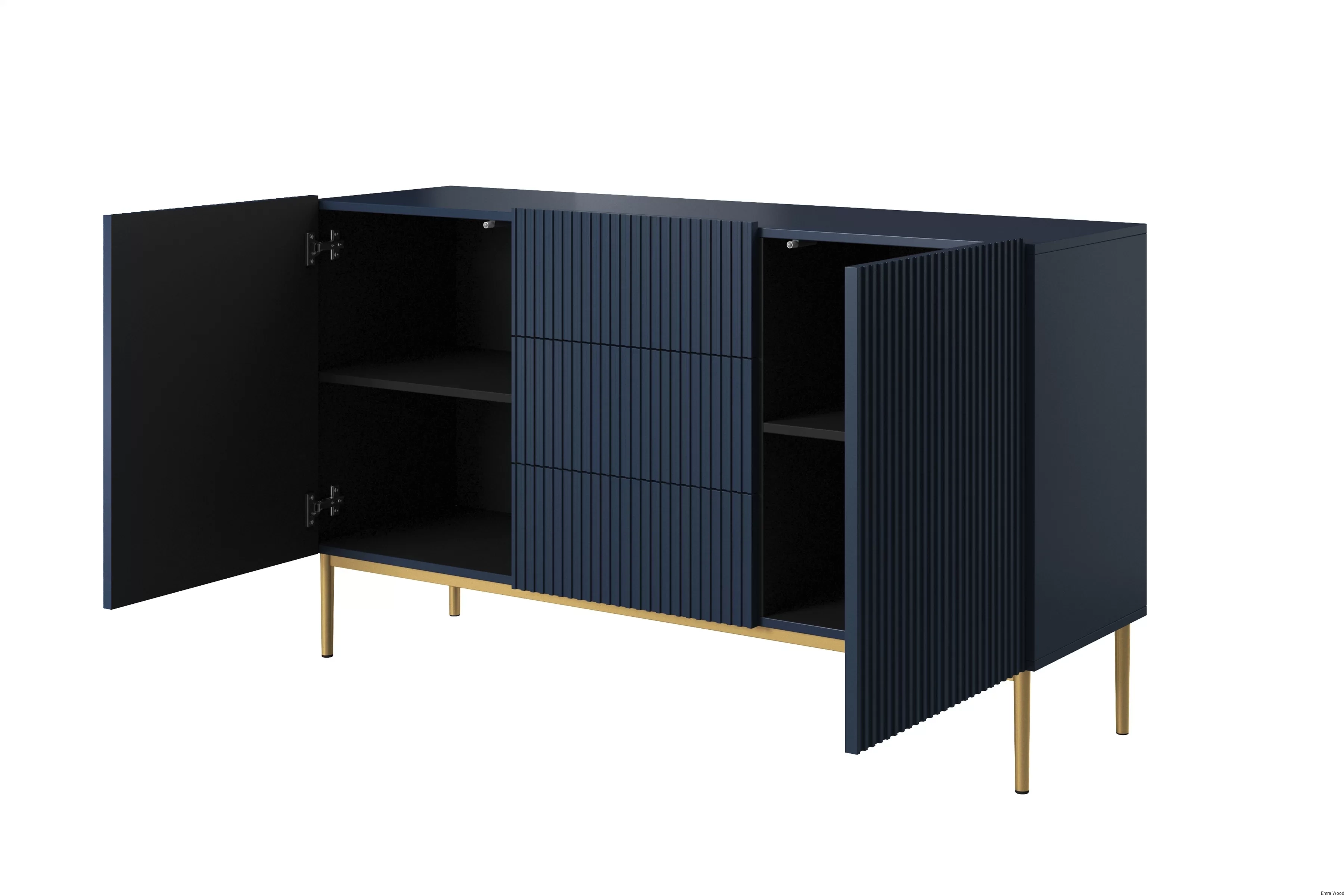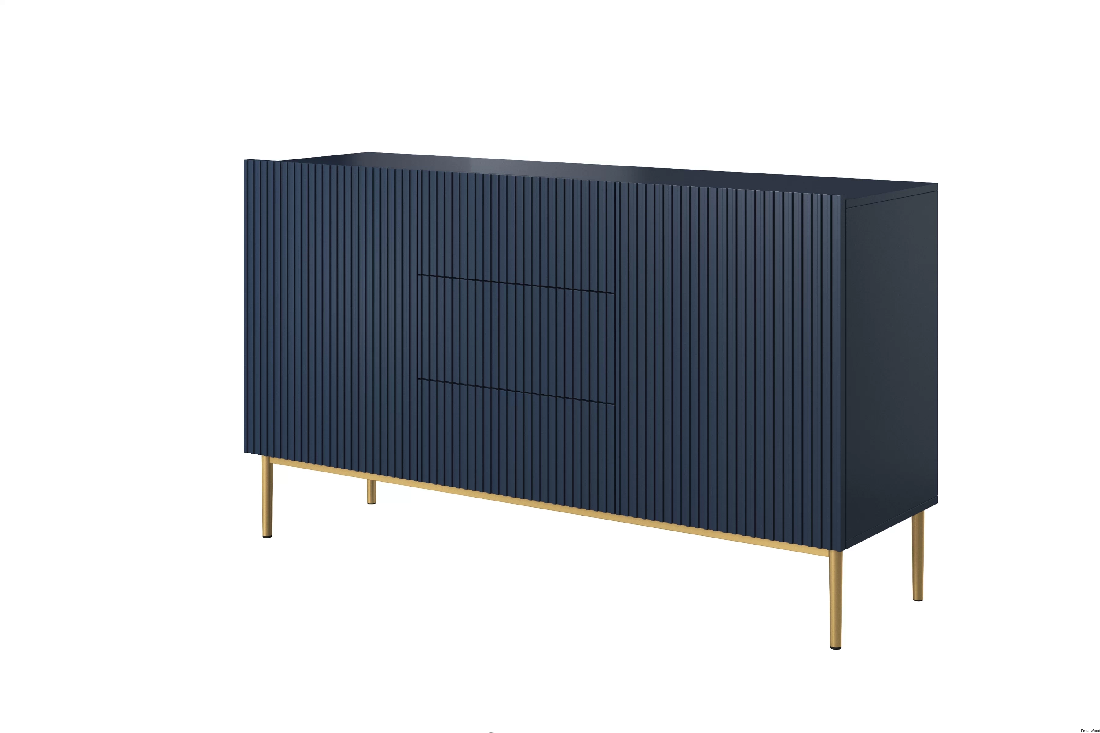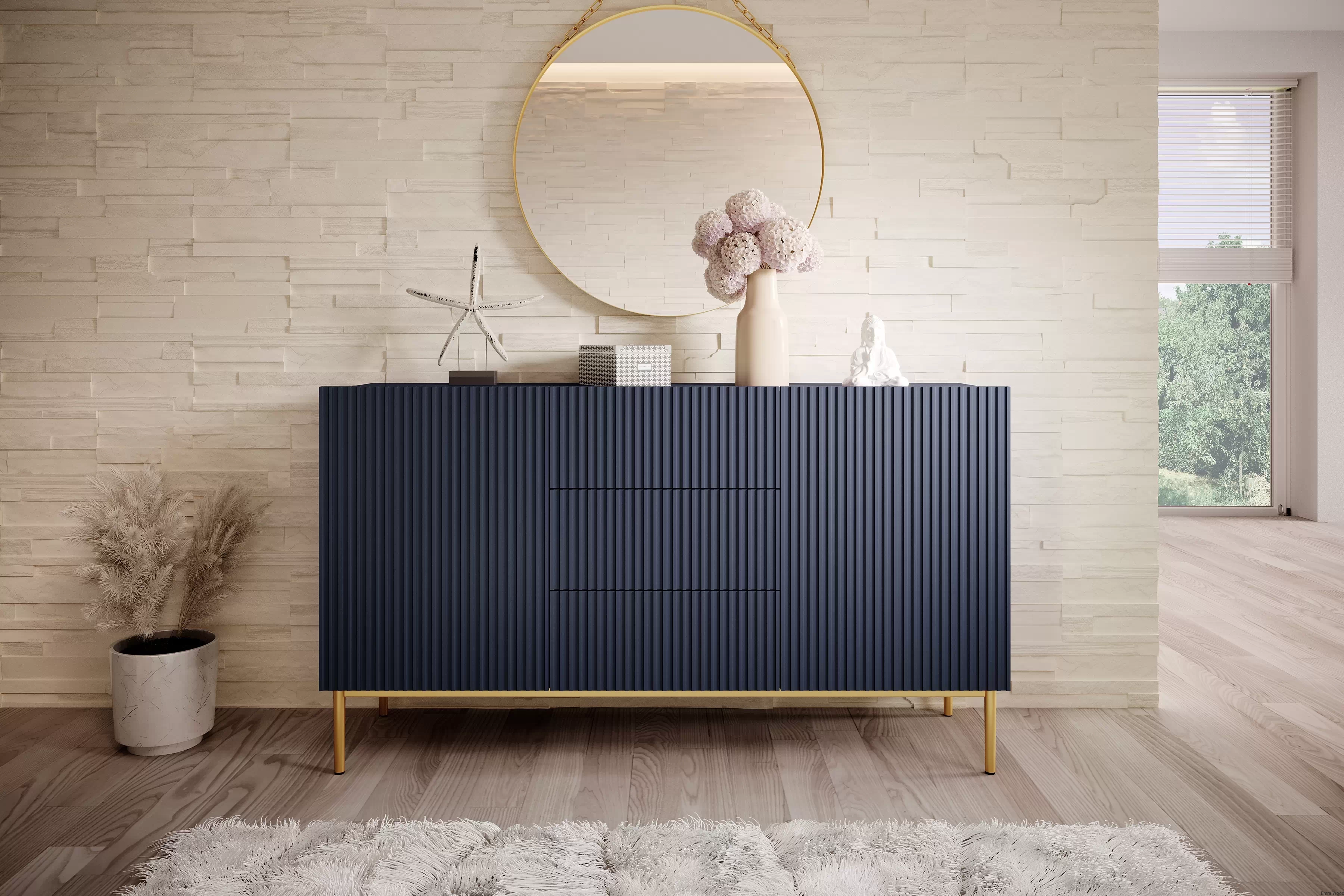 Wyobraź sobie ten mebel w swoim wnętrzu. Jego granatowy kolor korpusu i frontu w matowym wykończeniu dodaje mu niepowtarzalnego uroku. Złote, metalowe nogi stanowią doskonałe dopełnienie całości, nadając mu wyjątkowego charakteru.