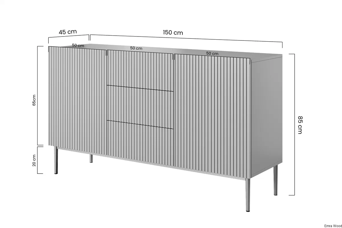 Wykonanie z płyty MDF gwarantuje trwałość i solidność konstrukcji. Szczególnie zwróć uwagę na ryflowany front, który dodaje meblowi elegancji. Wyposażenie obejmuje 2 drzwi i 3 szuflady, co zapewnia mnóstwo miejsca do przechowywania. System otwierania "push to open" i cichy domyk sprawiają, że użytkowanie jest niezwykle wygodne.