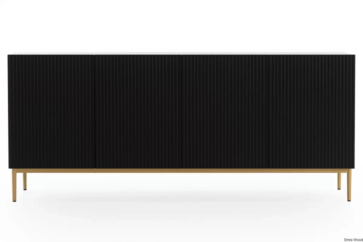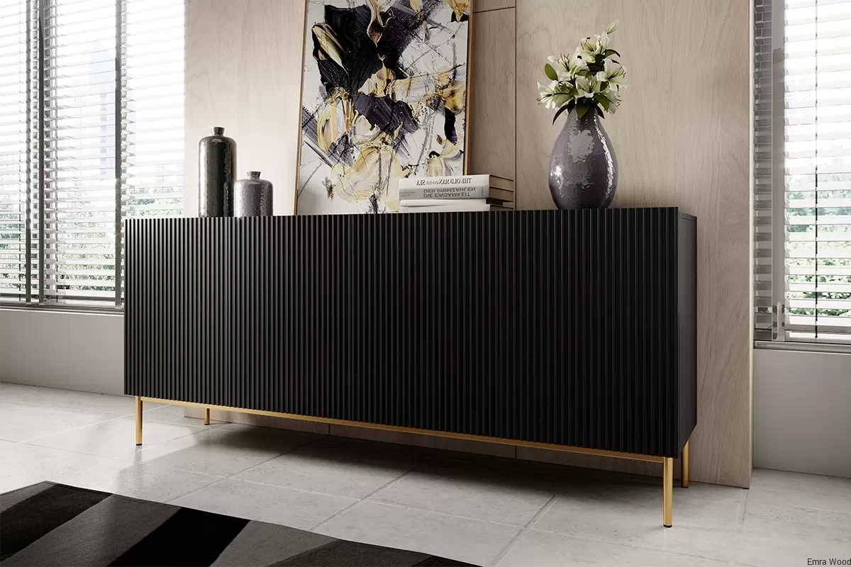 Stworzona z myślą o miłośnikach nowoczesnego designu, ta komoda zachwyca swoim wyrafinowanym wyglądem. Czarny matowy front i korpus w połączeniu ze złotymi nóżkami tworzą niepowtarzalny kontrast, który przyciąga wzrok i dodaje wnętrzu luksusowego charakteru. Ryflowane fronty dodają subtelnej elegancji, a brak uchwytów podkreśla minimalistyczny styl.