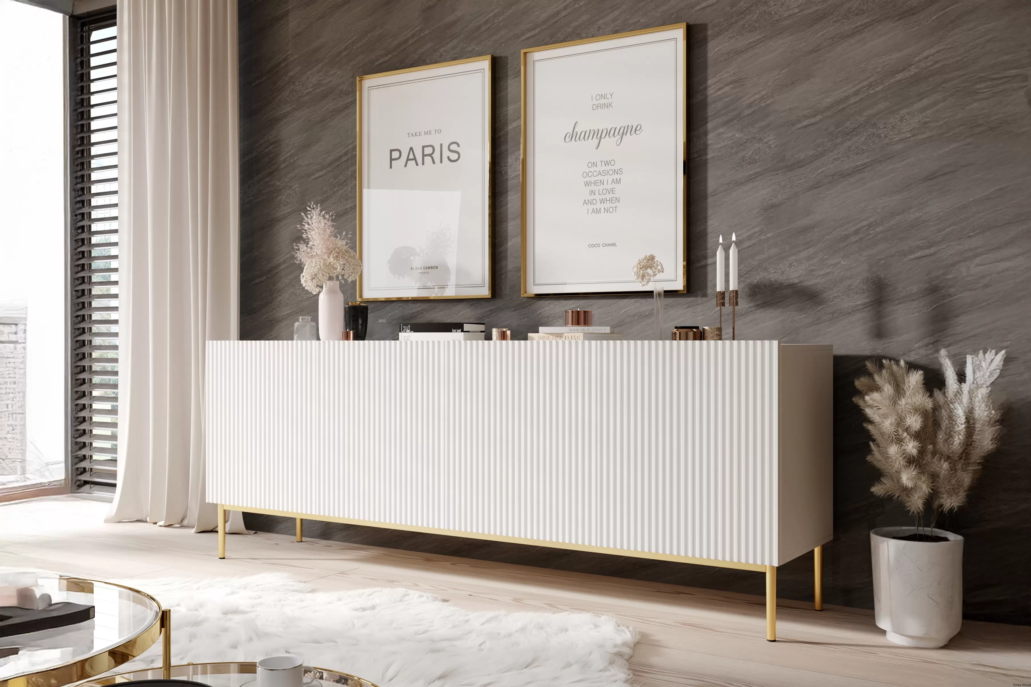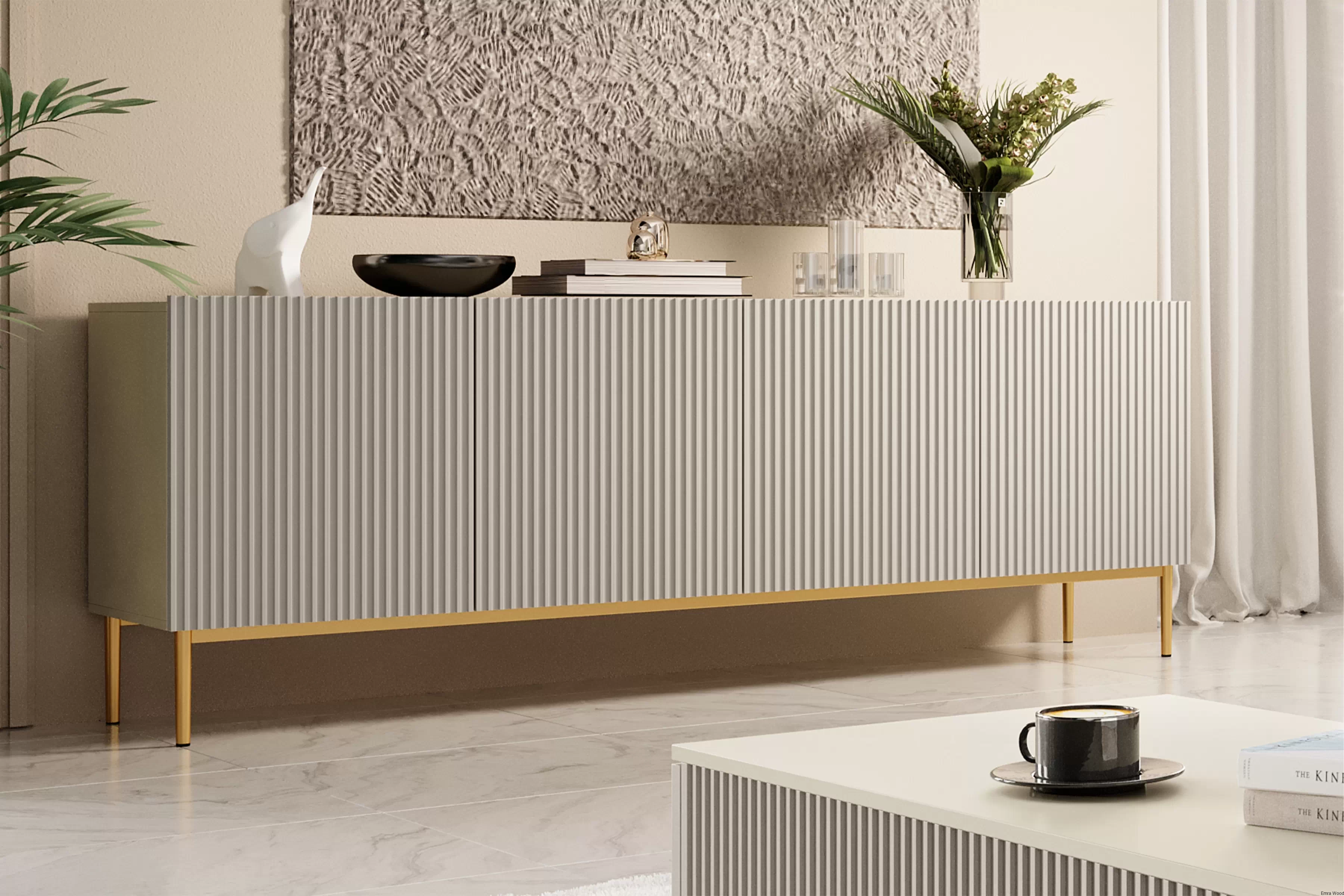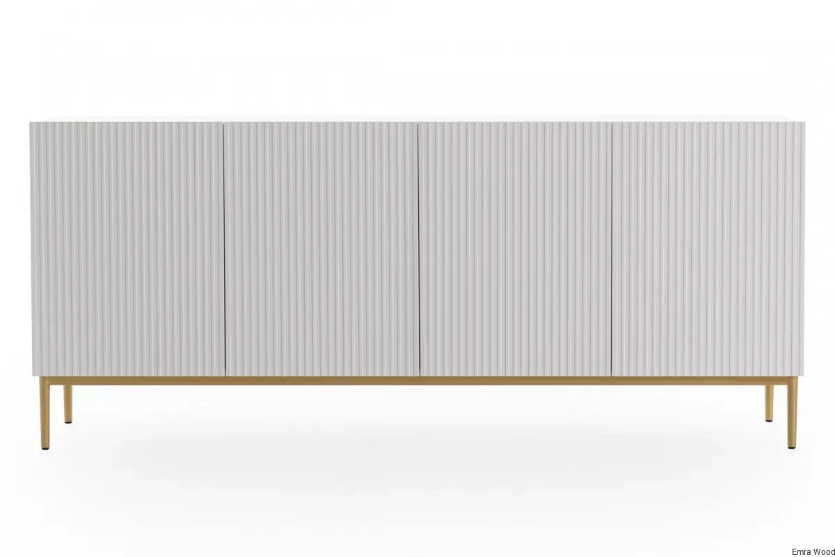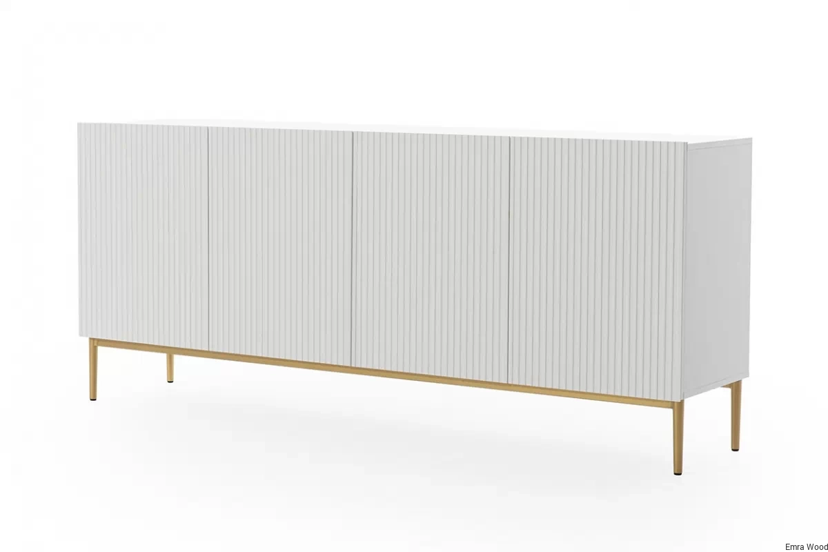 Ta komoda to kwintesencja nowoczesnego designu, która zachwyci każdego miłośnika stylowych wnętrz. Biały matowy front w połączeniu ze złotymi nóżkami tworzy unikalny, luksusowy wygląd, który idealnie wpisuje się w aktualne trendy wnętrzarskie. Ryflowane fronty dodają jej niepowtarzalnego charakteru, a brak uchwytów podkreśla minimalistyczną estetykę.
