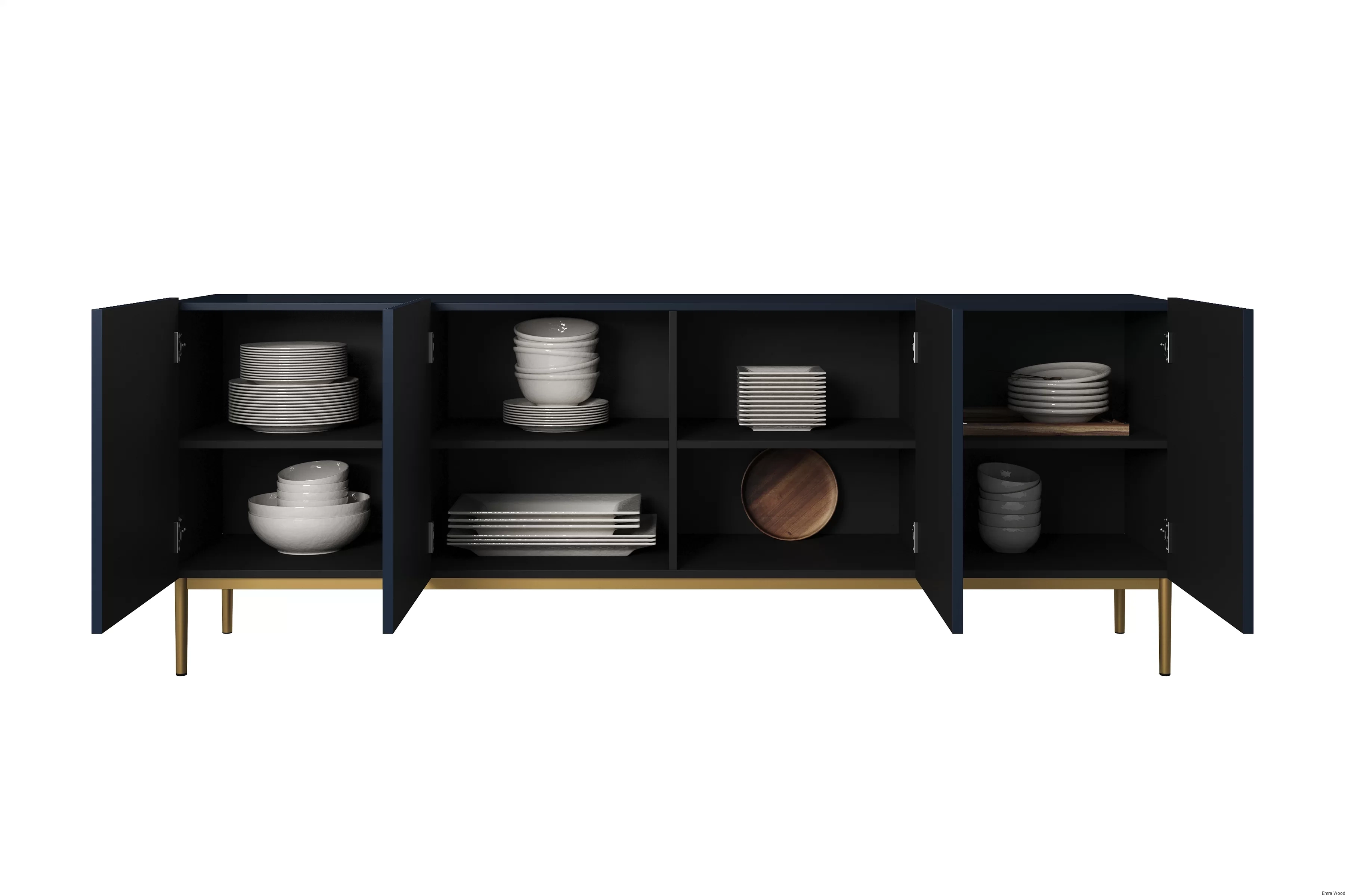 Wyjątkowa kolorystyka tej komody - połączenie głębokiego granatu z złotymi nóżkami - sprawia, że staje się ona prawdziwym klejnotem w każdym pomieszczeniu. Matowe wykończenie dodaje jej subtelności i klasy.