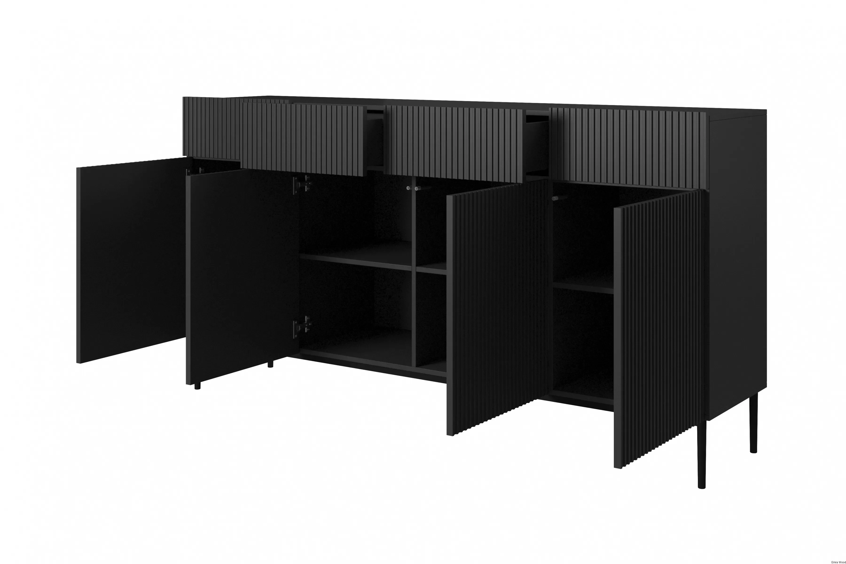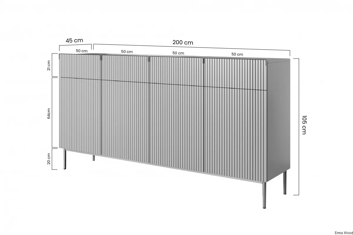 Oczarowuje minimalistycznym designem, który łączy w sobie klasykę z nowoczesnością. Czarny matowy kolor dodaje wnętrzu wyrafinowania i elegancji, a subtelne ryflowane fronty przyciągają wzrok i nadają komodzie unikalnego charakteru. Metalowe, czarne nóżki, malowane proszkowo, podkreślają industrialny styl, tworząc harmonijną całość.