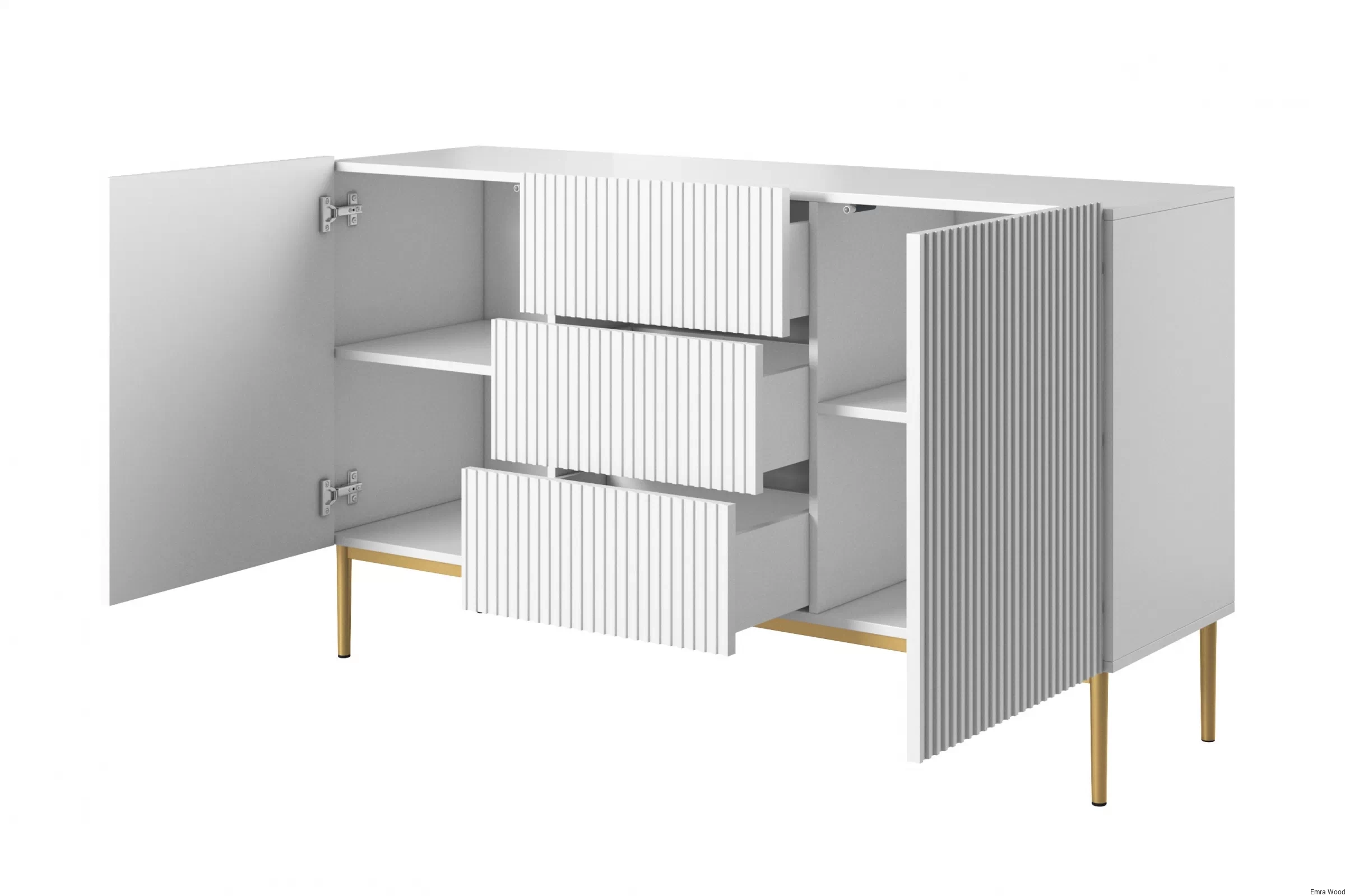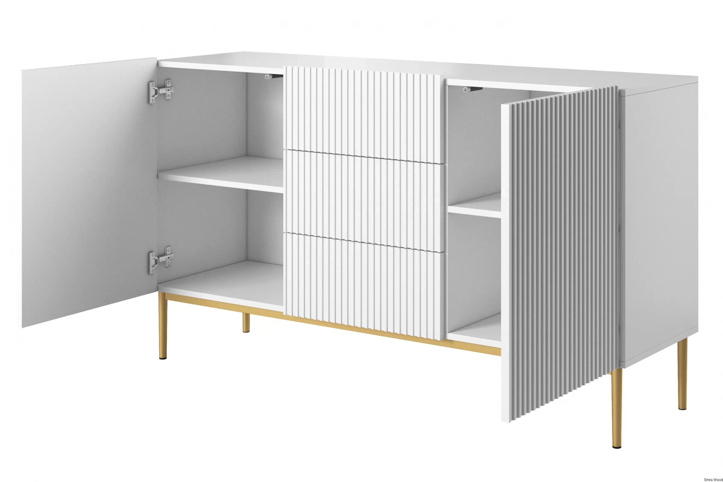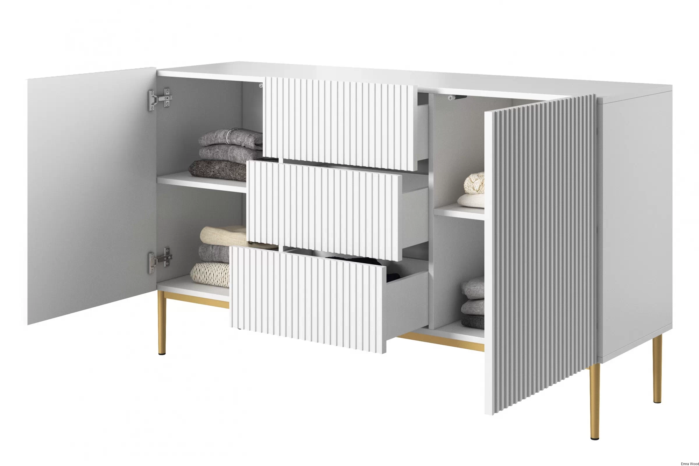 Komoda Nicole zachwyca swoim wyglądem - matowy biały kolor korpusu i frontu kontrastuje z złotymi nogami, tworząc efektowne połączenie. Ta kolorystyka sprawia, że mebel ten będzie pasował do różnych stylów wnętrz, dodając im elegancji i nowoczesności.