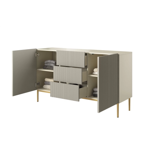 Czy szukasz komody, która nie tylko spełni swoją funkcję, ale także doda charakteru Twojemu wnętrzu? Komoda Nicole 150 cm z szufladami i metalowymi nogami w kolorze kaszmiru z złotymi nóżkami to właśnie to, czego potrzebujesz.