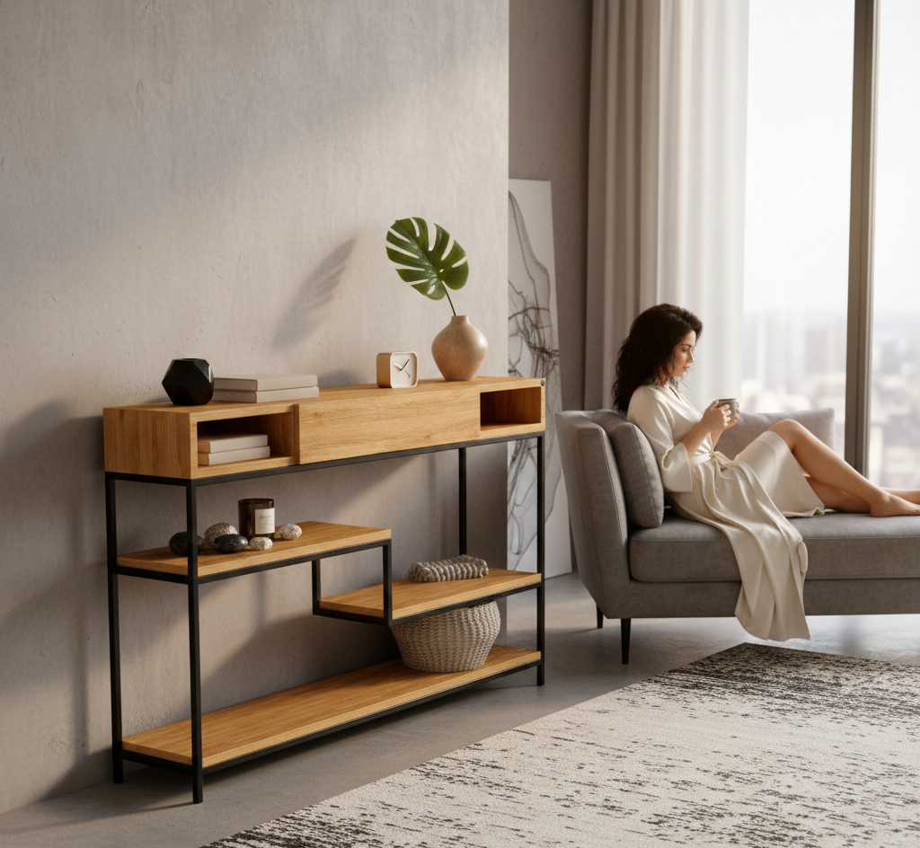KONSOLA / Stelaż Stalowy Czarny / Drewno Lite model SKD-315 produkowana w rozmiarach od 50 cm do 200 cm