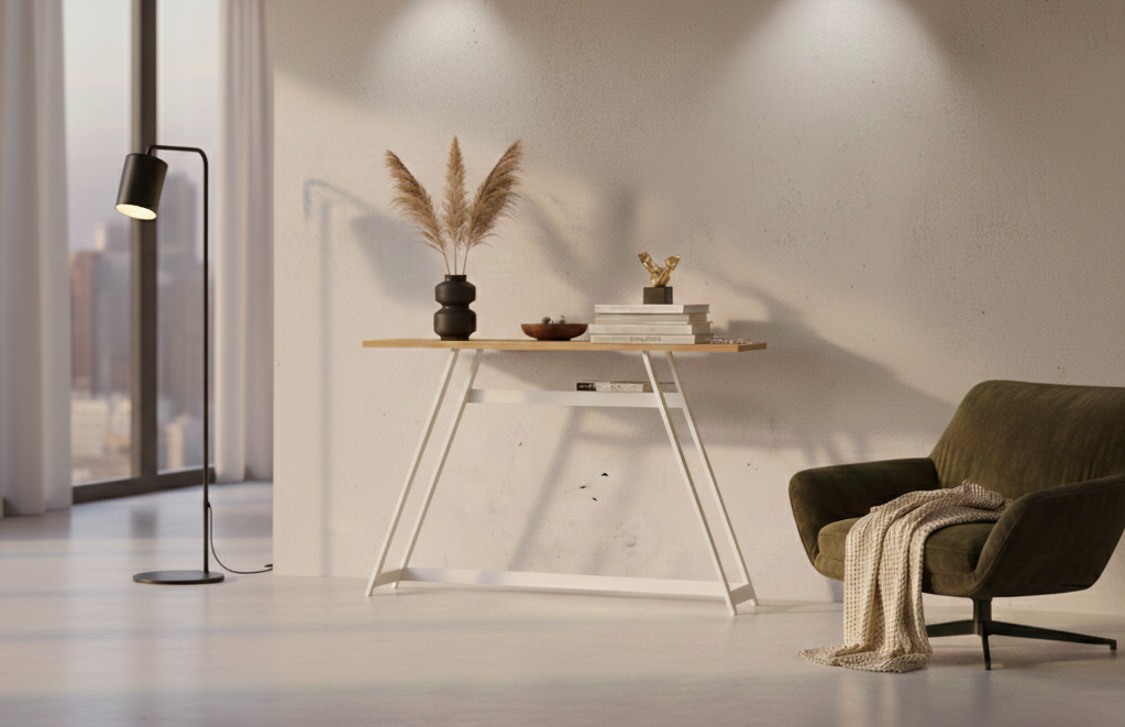 KONSOLA - REGAŁ / Stelaż Stalowy Biały / Gatunek Drewna DĄB model SKD-381 produkowana w rozmiarach od 100 cm do 200 cm