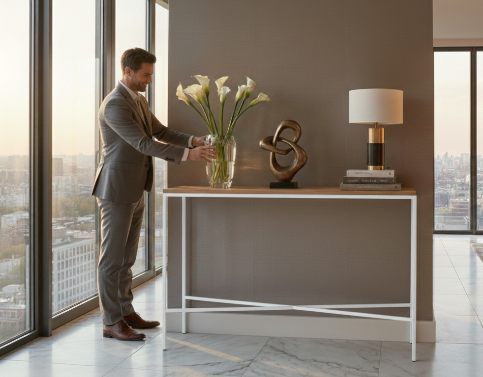 KONSOLA - REGAŁ / Stelaż Stalowy Biały / Gatunek Drewna DĄB model SKD-385 produkowana w rozmiarach od 100 cm do 200 cm