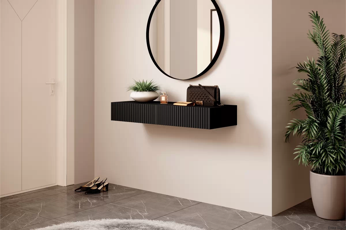 Elegancki design tej toaletki przyciąga wzrok swoim nowoczesnym wyglądem. Czarny matowy kolor frontów i korpusu dodaje wnętrzu klasy i wyrafinowania, a ryflowane fronty nadają całości unikalnego charakteru. Dzięki minimalistycznej formie toaletka doskonale wpasuje się w każde wnętrze, dodając mu niepowtarzalnego stylu.