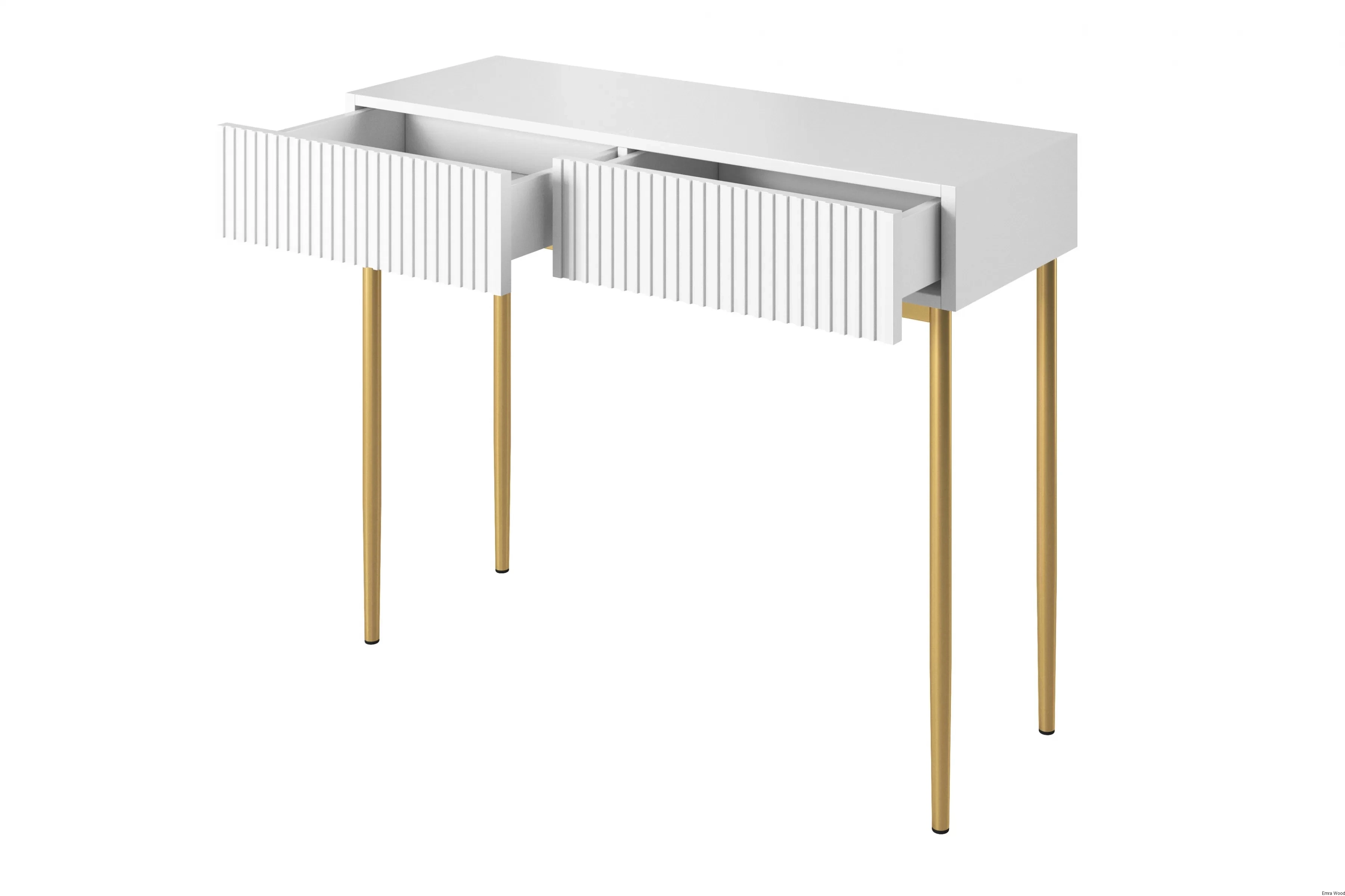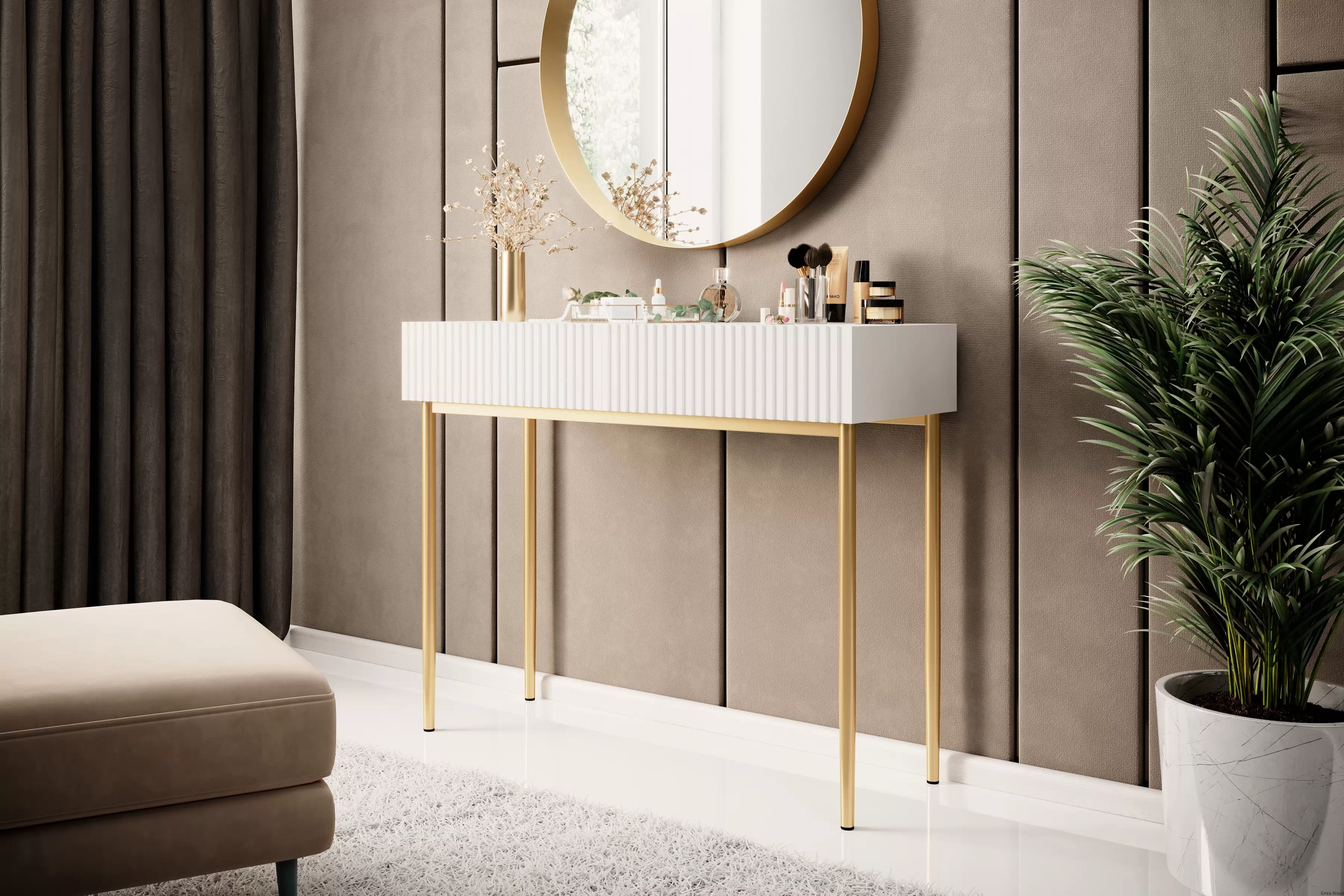 Mebel ten idealnie wpasuje się w nowoczesne, minimalistyczne wnętrza. Biały matowy kolor i złote nóżki tworzą elegancki kontrast, który doda klasy każdemu pomieszczeniu. Toaletka Nicole będzie doskonale komponować się z innymi meblami w podobnym stylu, tworząc spójną i harmonijną aranżację.