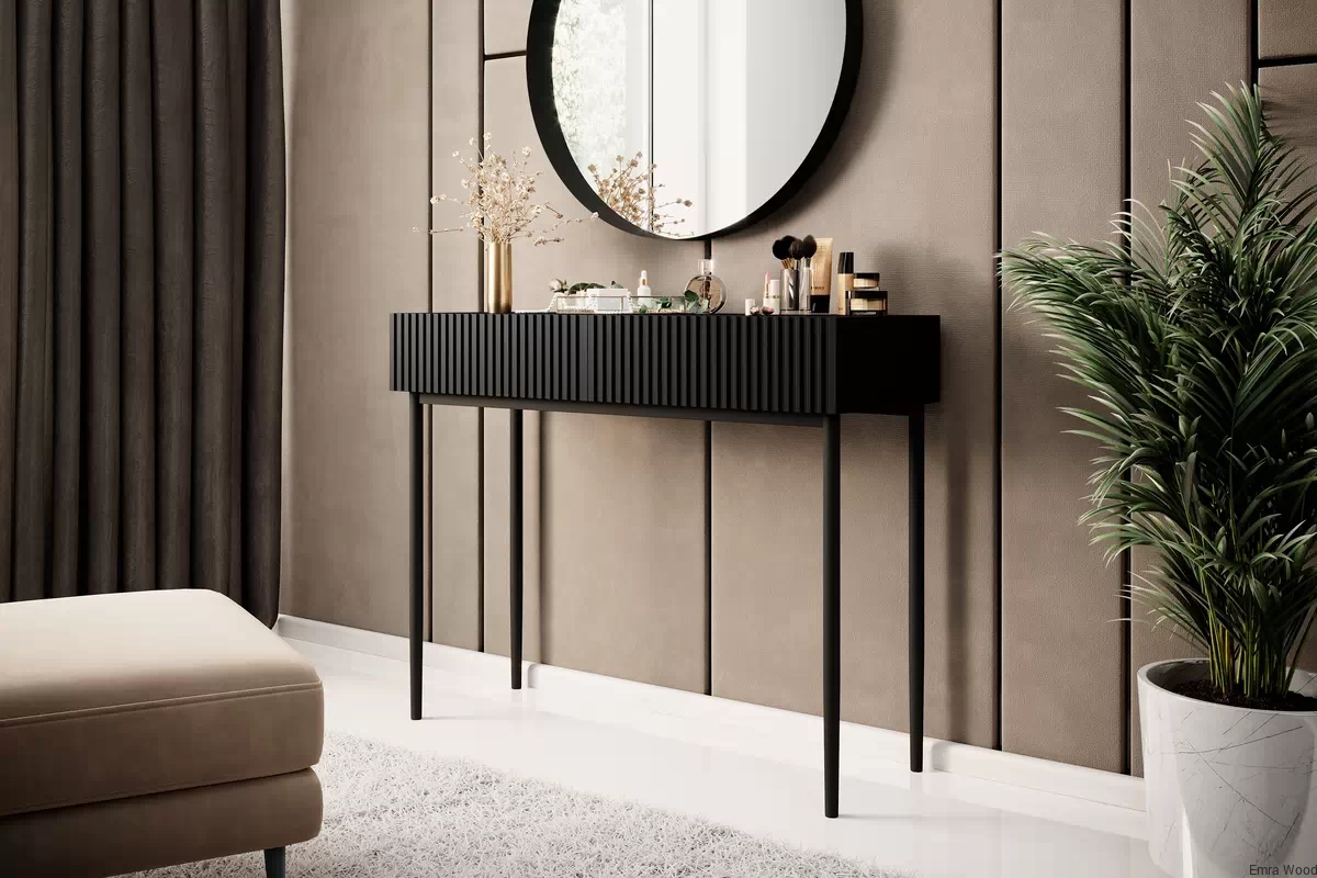 Konsola/toaletka Nicole została wykonana z wysokiej jakości materiałów - korpus z płyty laminowanej 16 mm i front z płyty MDF 18 mm. Dzięki temu mebel jest nie tylko trwały, ale także funkcjonalny. Dwa szuflady wyposażone w system cichego domyku zapewniają komfort użytkowania i dodatkową przestrzeń do przechowywania.