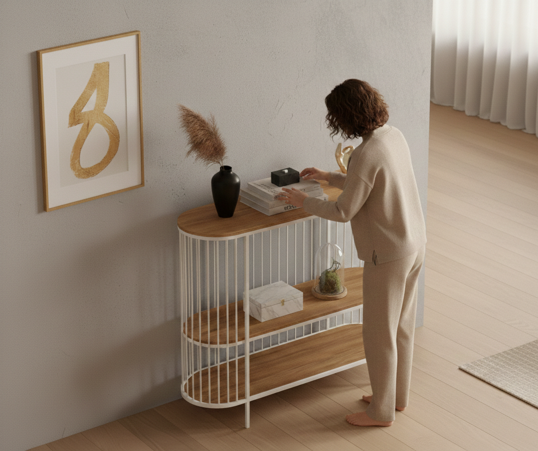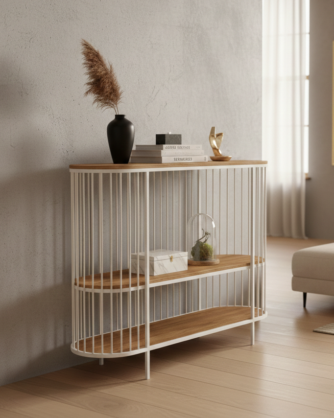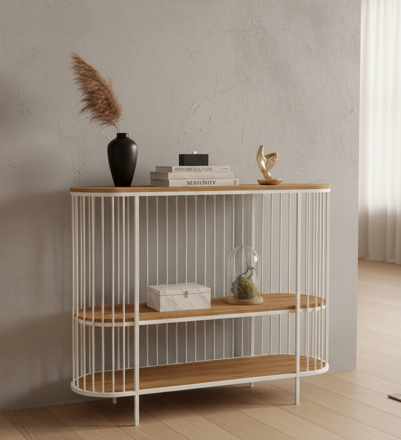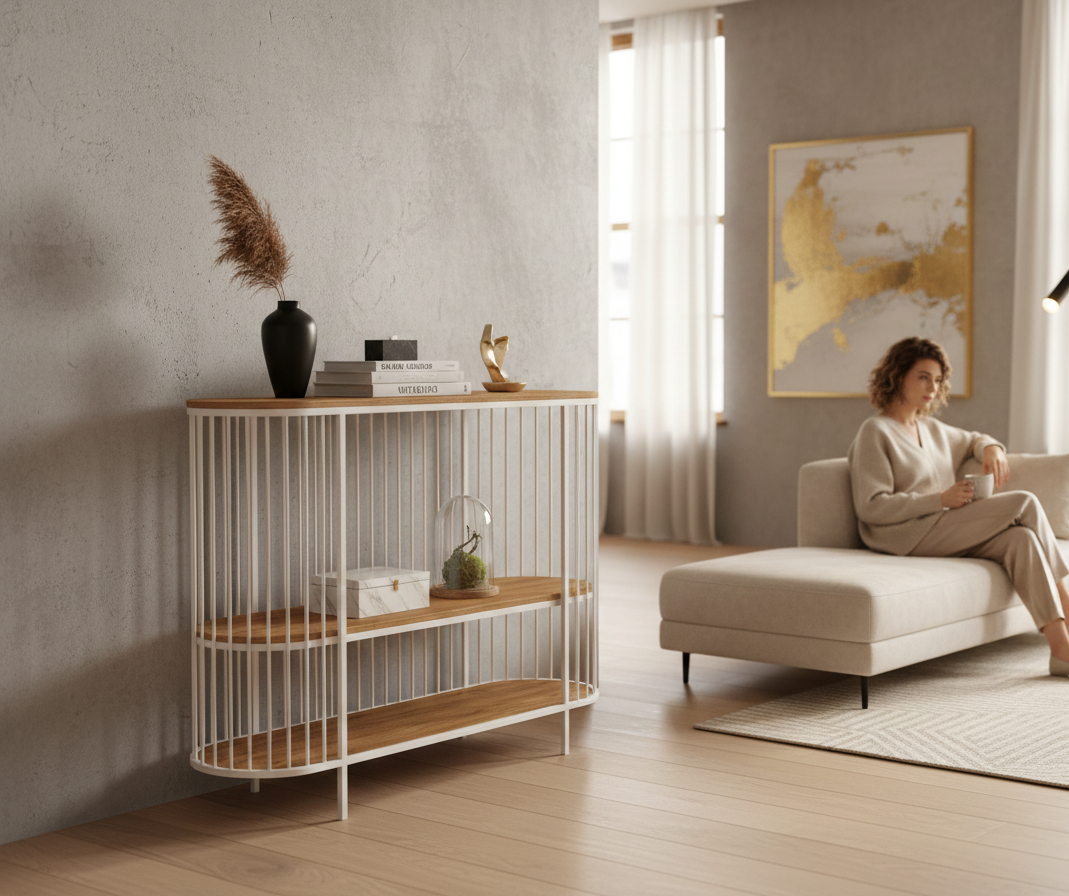 KONSOLA / Stelaż Stalowy Biały / Gatunek Drewna DĄB model SKD-346 produkowana w rozmiarach od 50 cm do 200 cm