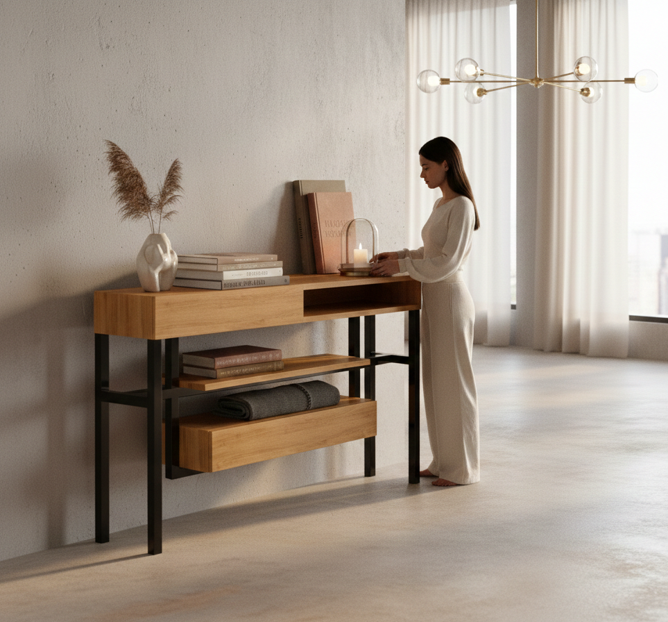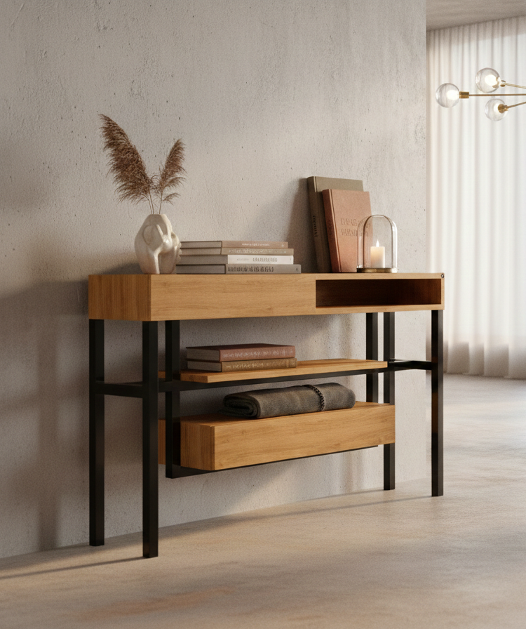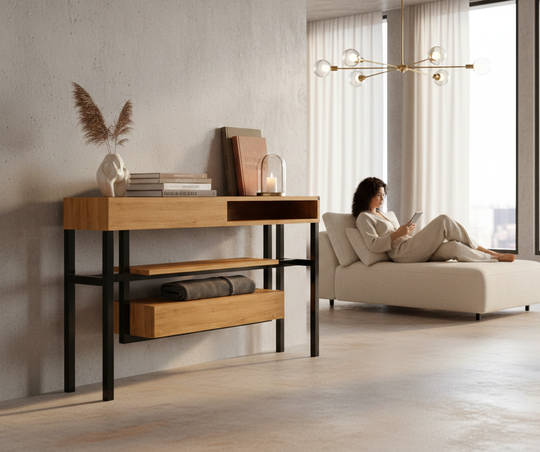 KONSOLA / Stelaż Stalowy Czarny / Gatunek Drewna DĄB model SKD-304 produkowana w rozmiarach od 50 cm do 200 cm
