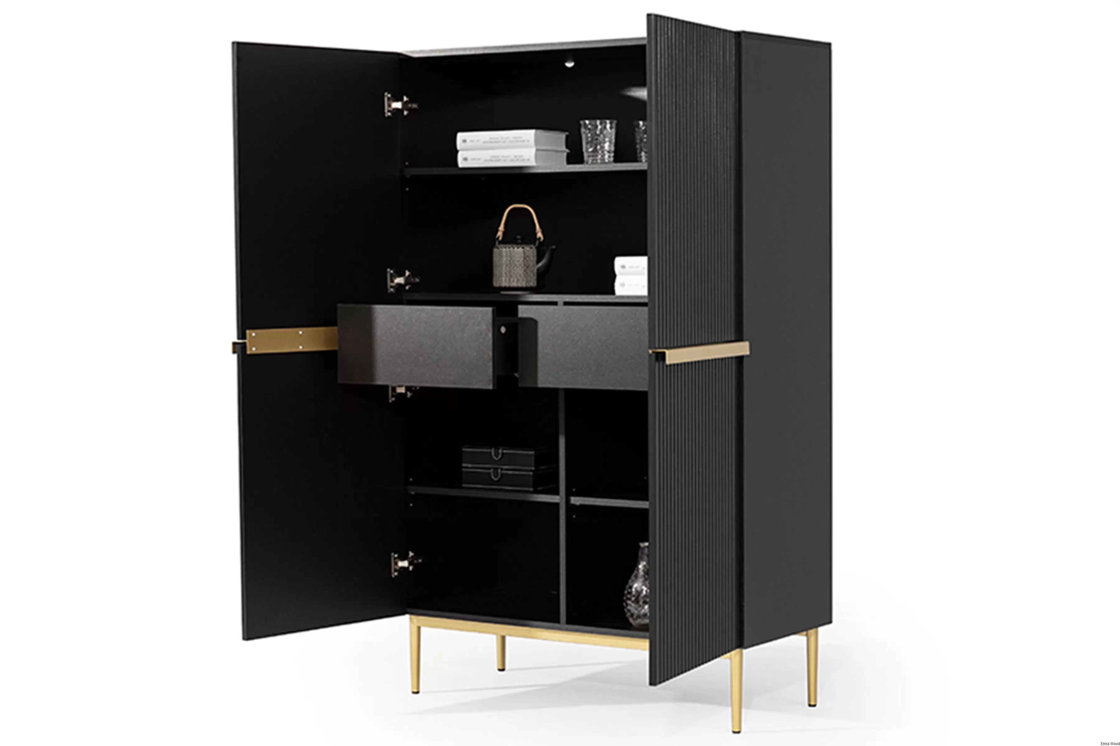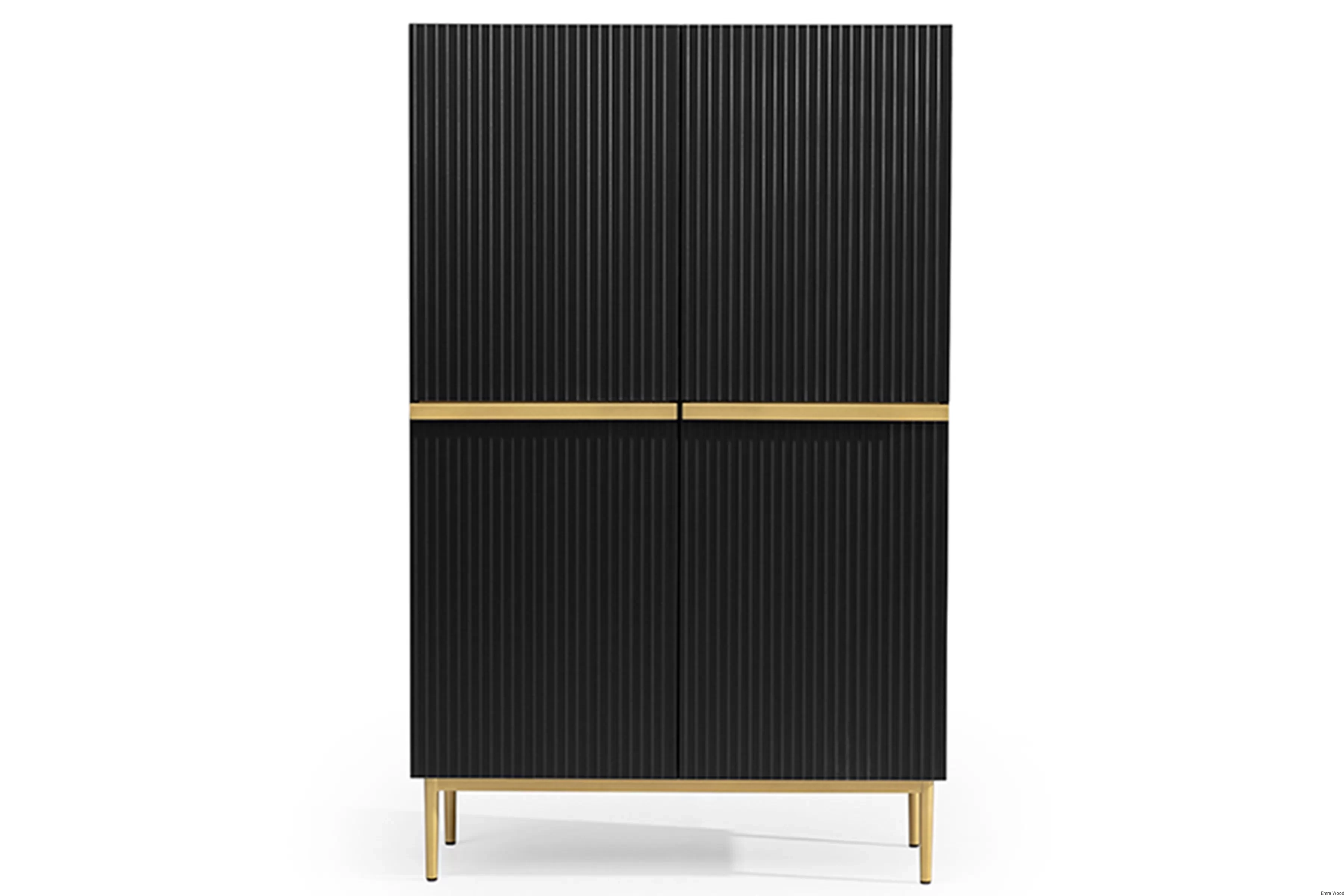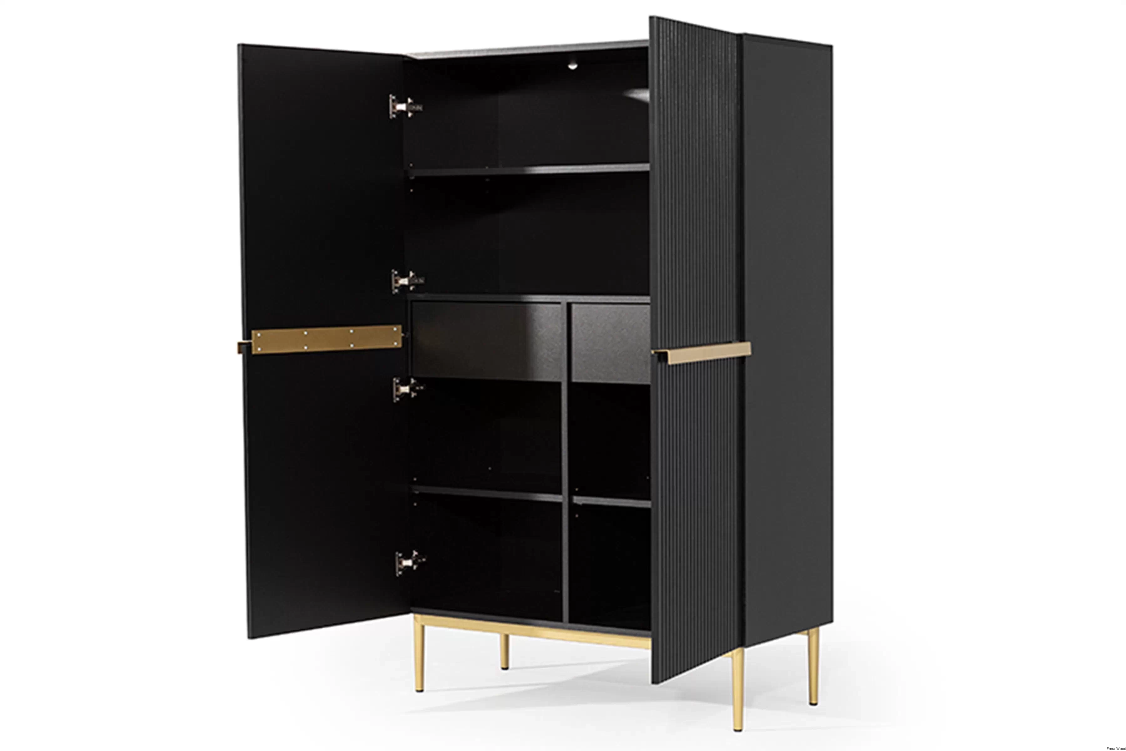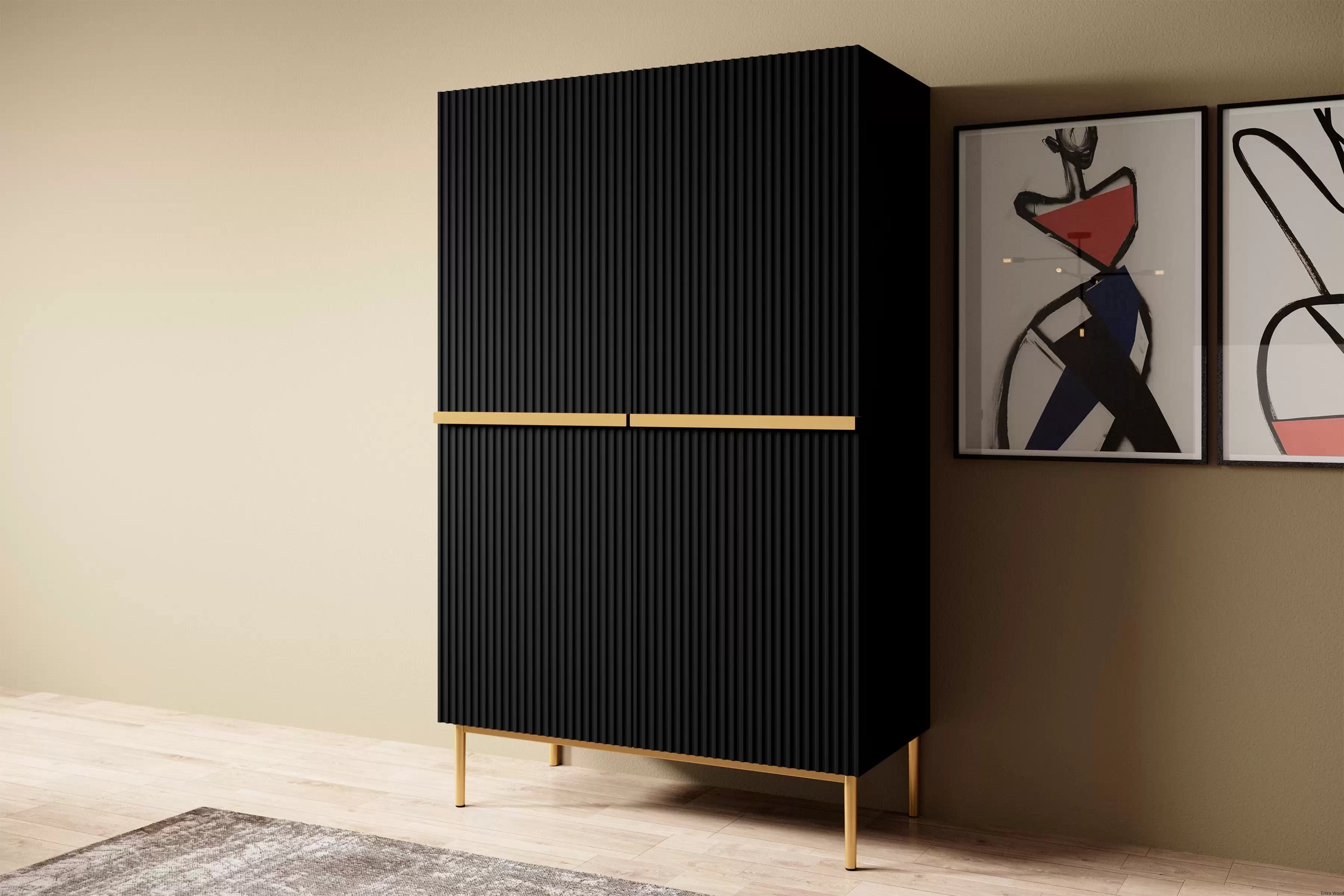Wyjątkowy design tego kredensu z pewnością przyciągnie Twoją uwagę. Czarny matowy kolor korpusu i frontu, w połączeniu ze złotymi metalowymi nóżkami, tworzy wyrazisty, ale zarazem elegancki kontrast. Ryflowane fronty dodają meblowi niepowtarzalnego charakteru, który podkreśli Twoją indywidualność.