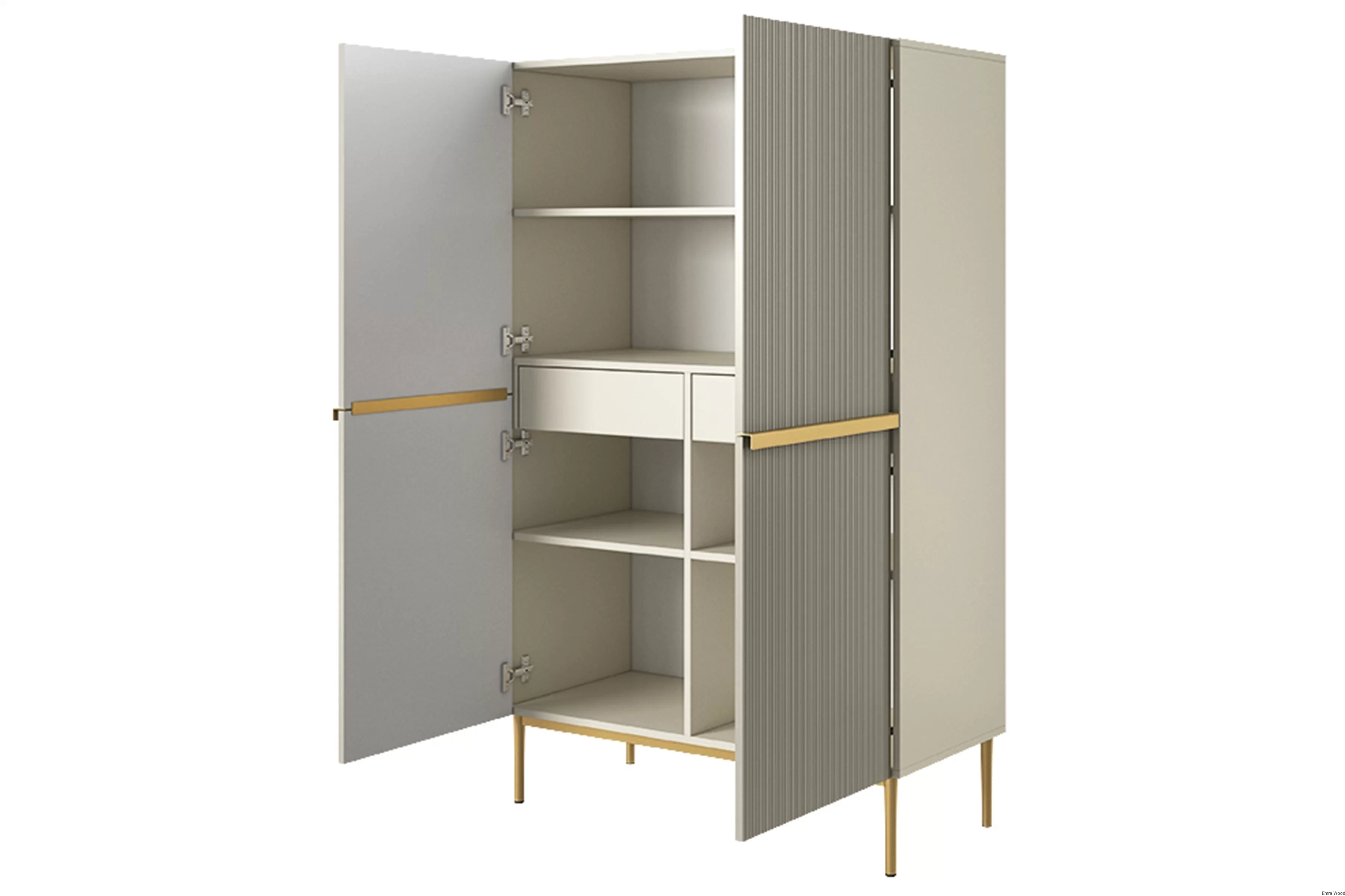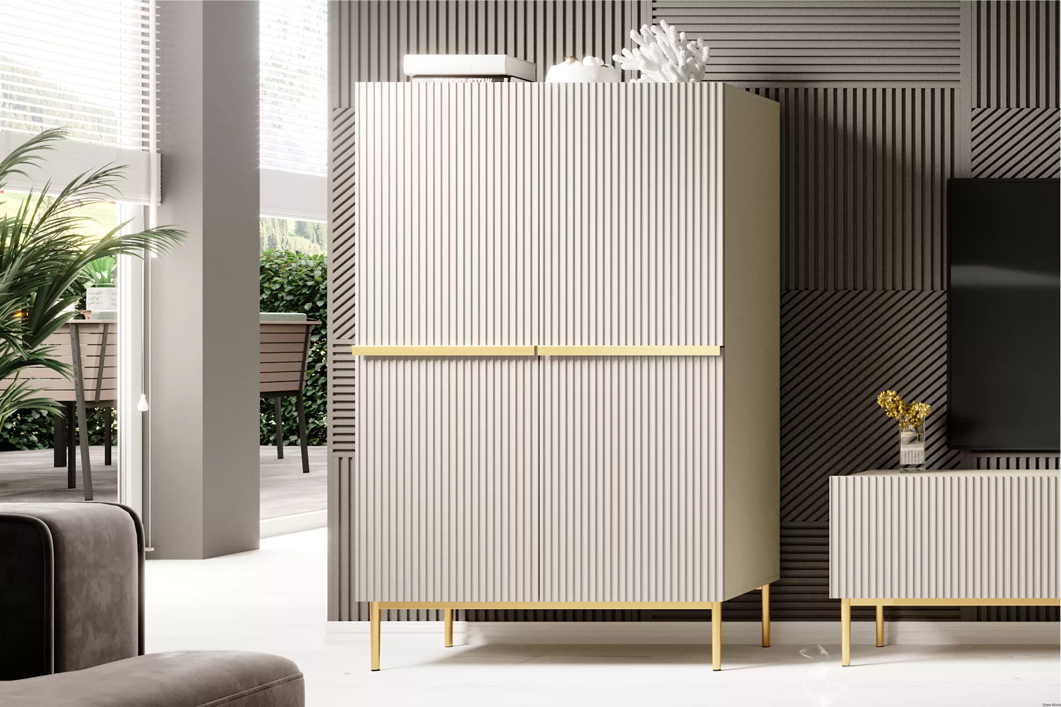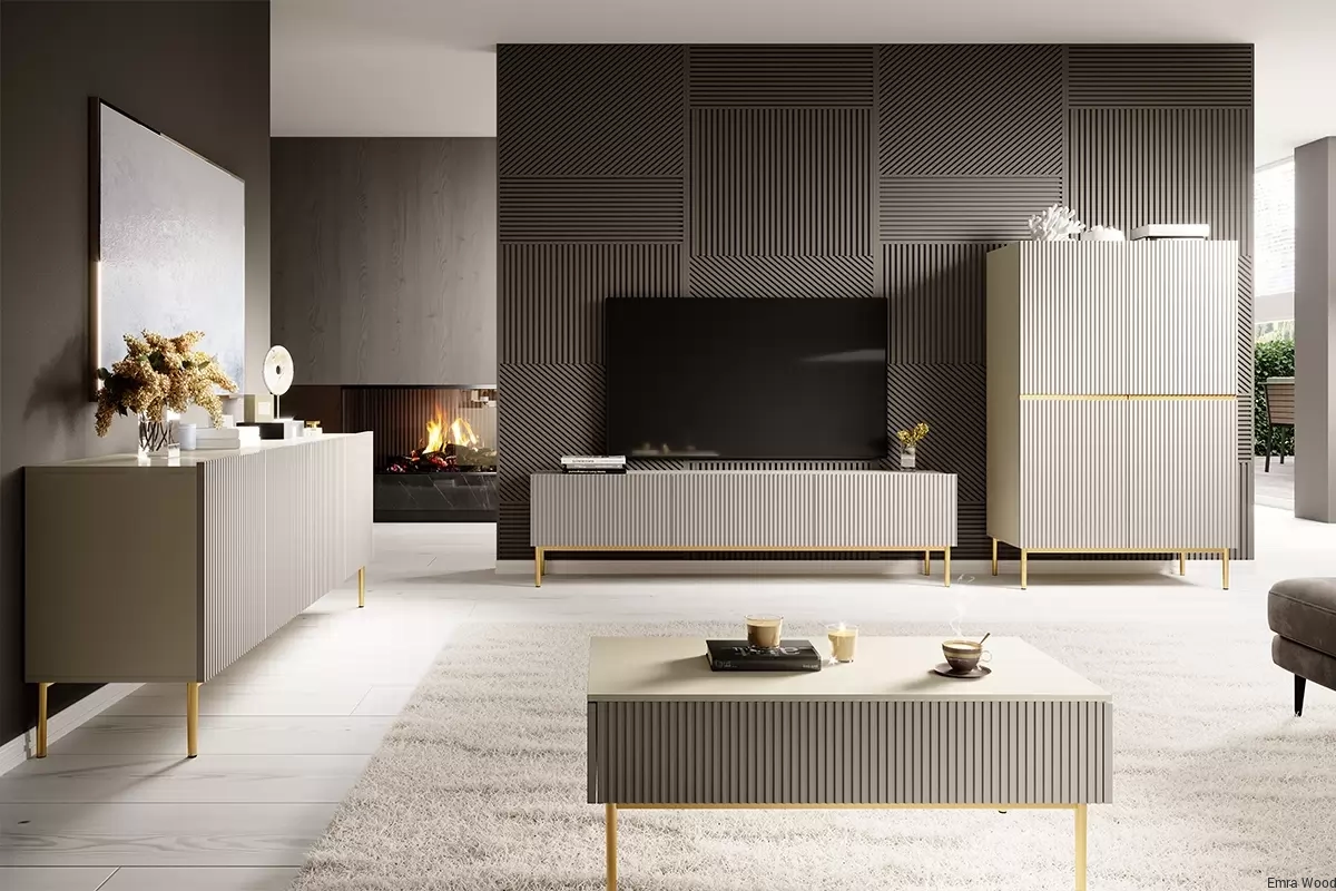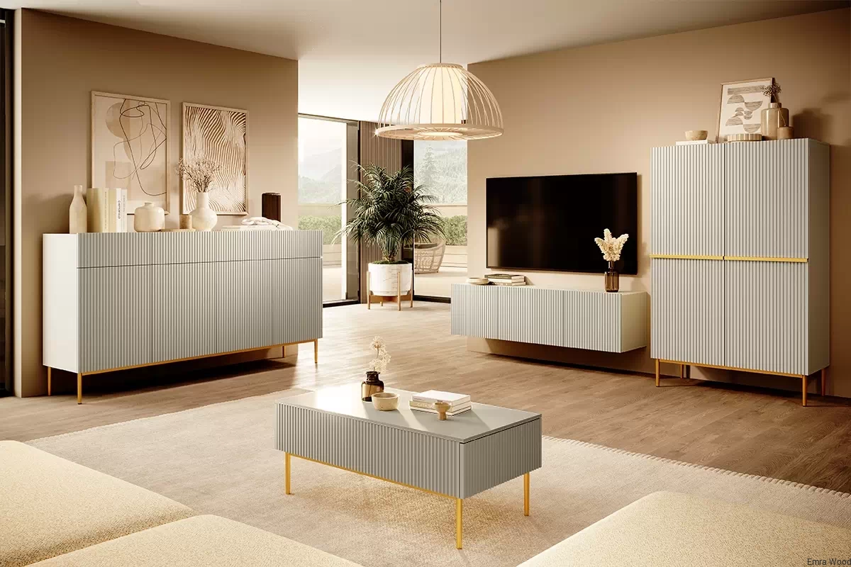 Kredens Nicole idealnie wpasuje się w nowoczesne, minimalistyczne wnętrza. Jego neutralna kolorystyka sprawia, że doskonale komponuje się z innymi meblami, a złote akcenty dodają mu wyrafinowanej elegancji.