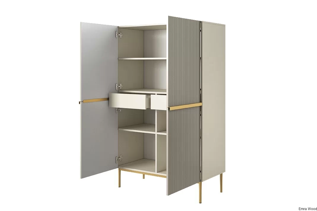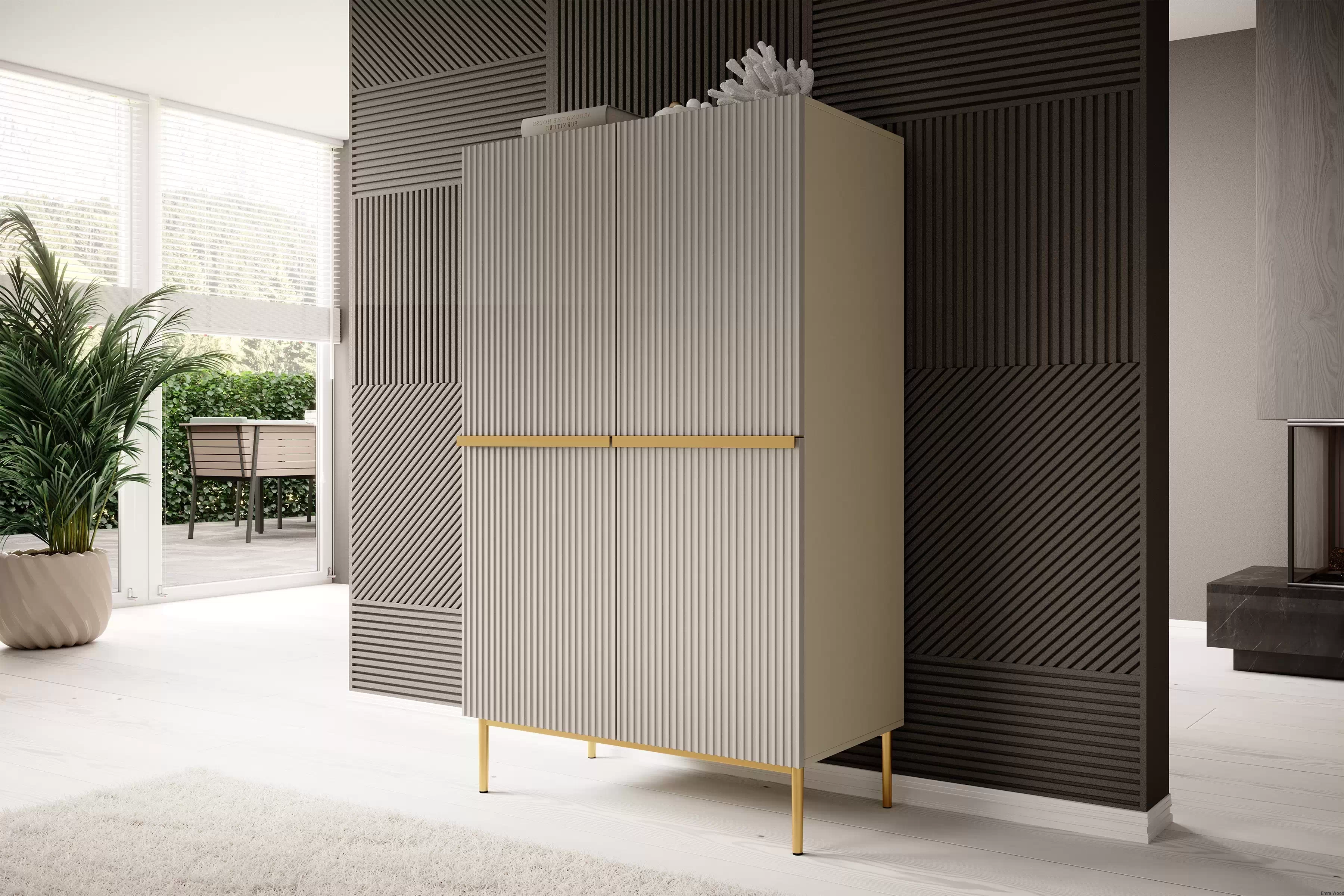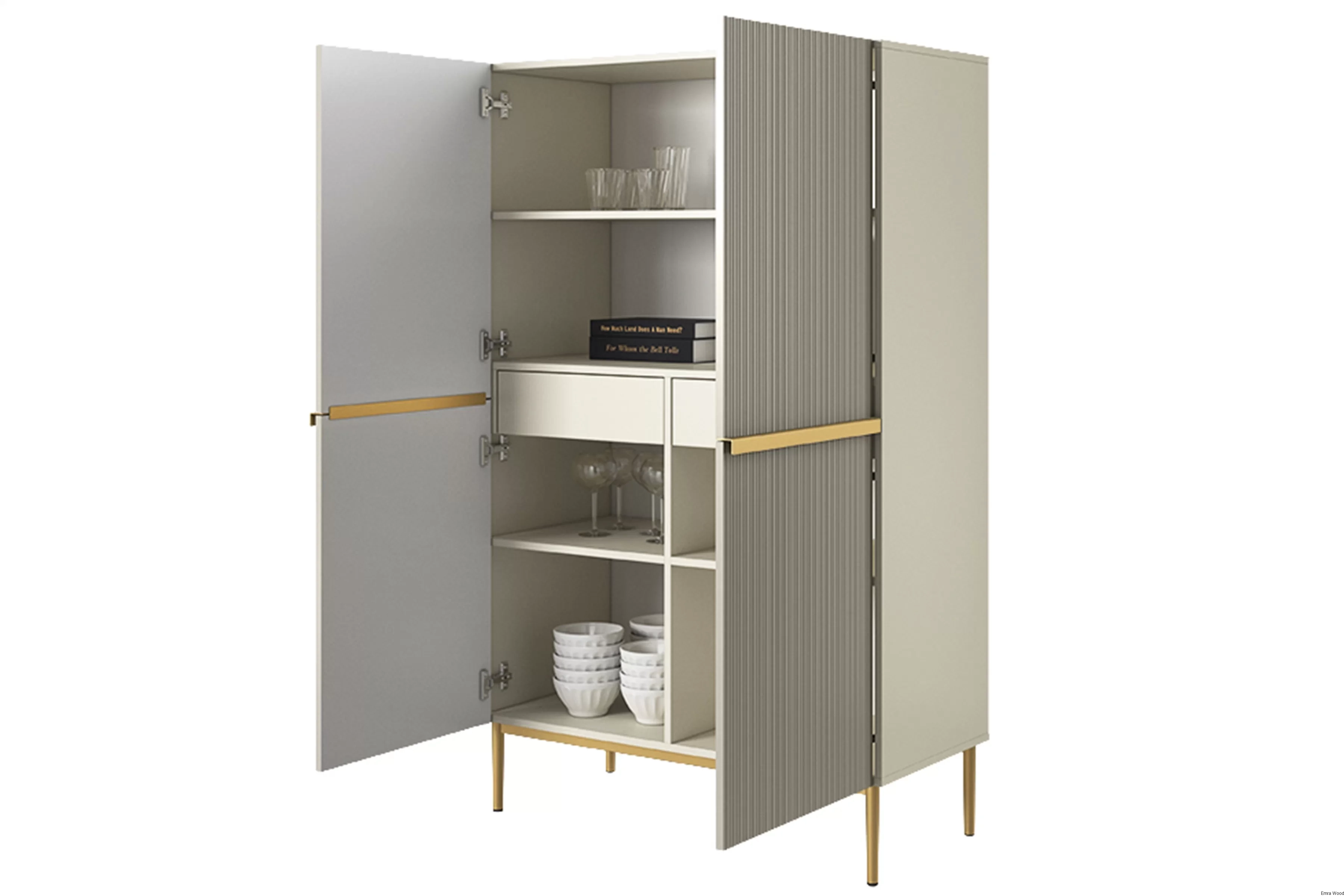 Kredens Nicole idealnie wpasuje się w nowoczesne, minimalistyczne wnętrza. Jego neutralna kolorystyka sprawia, że doskonale komponuje się z innymi meblami, a złote akcenty dodają mu wyrafinowanej elegancji.