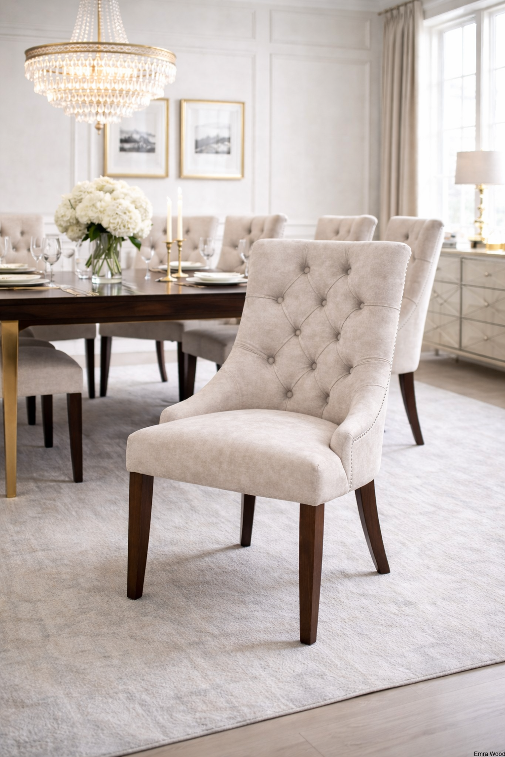 • Krzesło jest tapicerowane tkaniną welur, pięknie uzupełnia się z drewnianymi nóżkami, dodając mu szyku i elegancji.