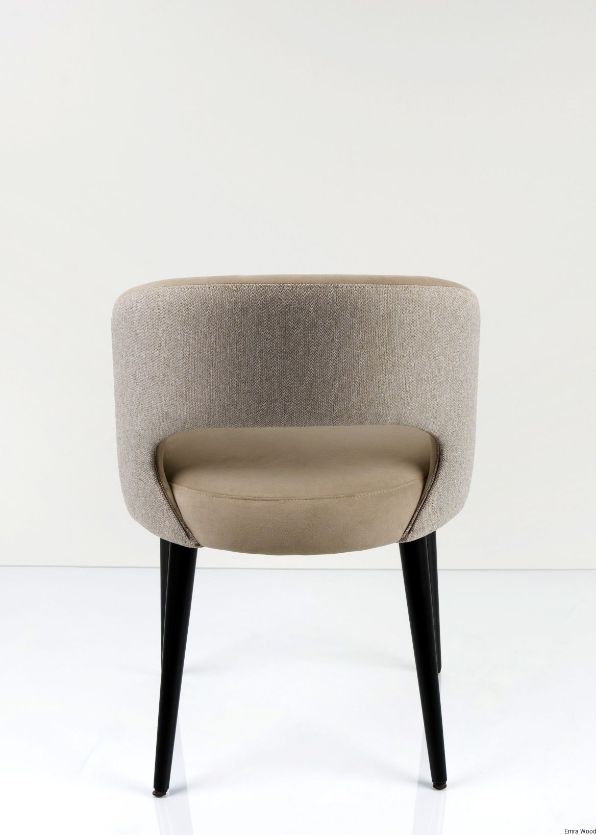 Zaokrąglone oparcie płynnie przechodzi w podłokietniki, dzięki czemu krzesło zapewnia wygodne podparcie pleców oraz ramion nawet podczas długiego siedzenia. Stabilne drewniane nogi gwarantują trwałość i bezpieczeństwo użytkowania, a miękkie tapicerowane siedzisko podnosi komfort codziennego użytkowania.